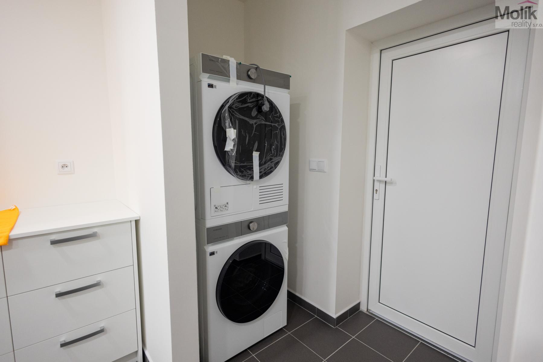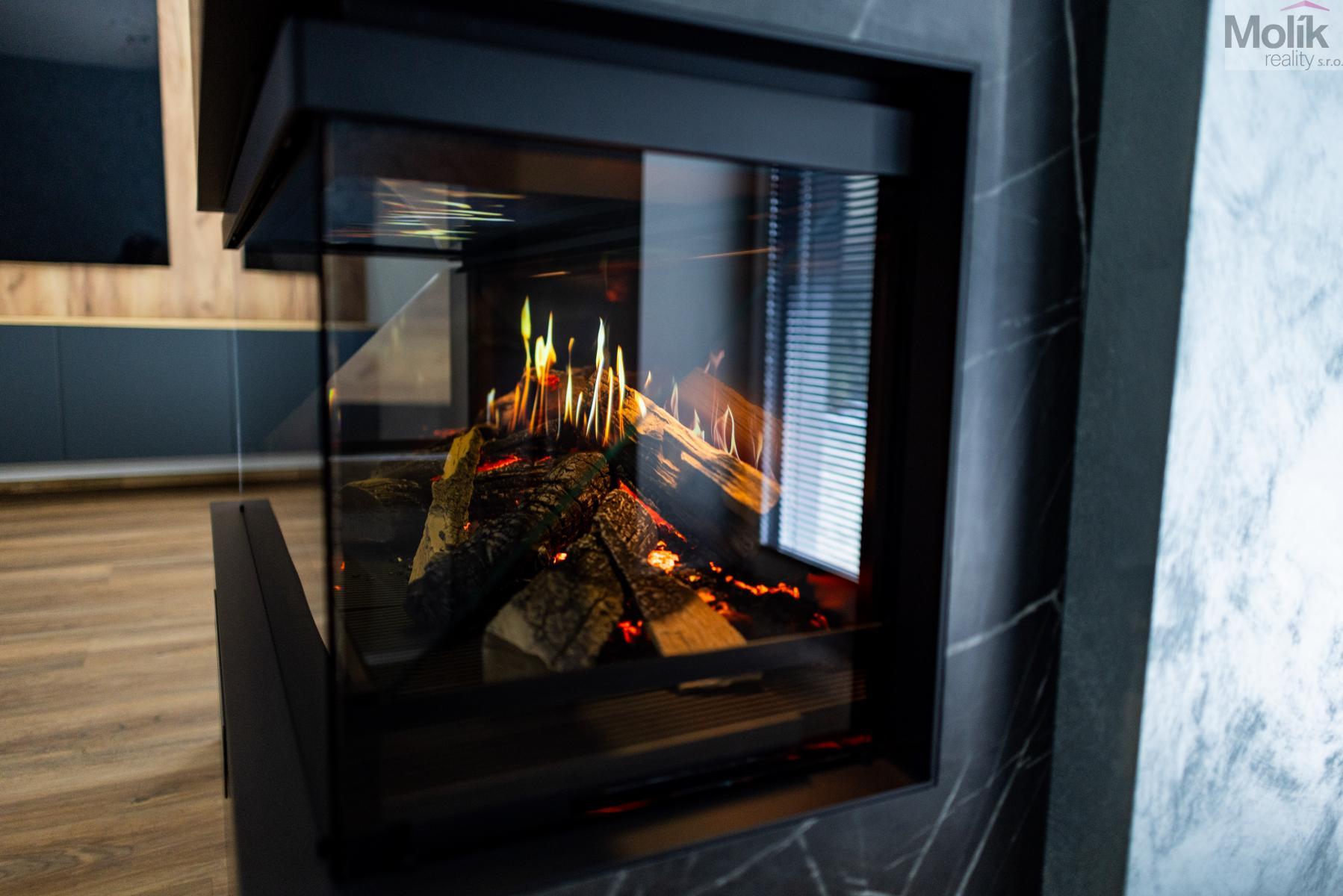 Přízemí: garáž s prádelnou včetně pračky a sušičky, vestavěné skříně a regály, el. sekční vrata, průchozí vstupní hala s vestavěnou skříní, WC s umyvadlem, špajz, kuchyně včetně spotřebičů a obývací pokoj s 3D krbem, el. polohovatelnou sedačkou, stolkem, nábytkem, jídelním stolem včetně židlí a to vše od Hanáka, TV s úhlopříčkou 2m.