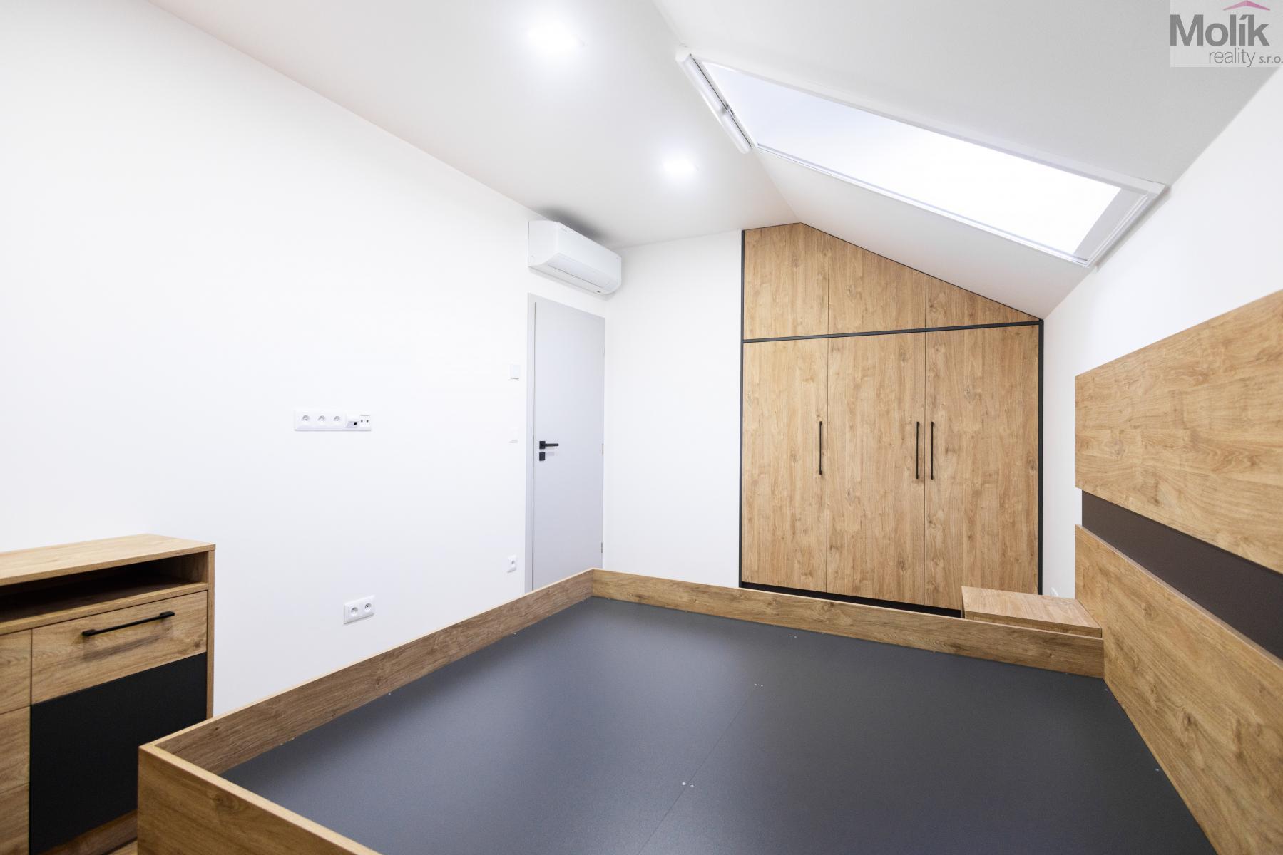 V patře se nachází 4 zařízené pokoje včetně nábytku, skříní a postelí s matracemi, to vše vyrobeno na zakázku, každý pokoj má klimatizaci, koupelna s WC, vanou, sprchový koutem a umyvadlem, technická místnost.