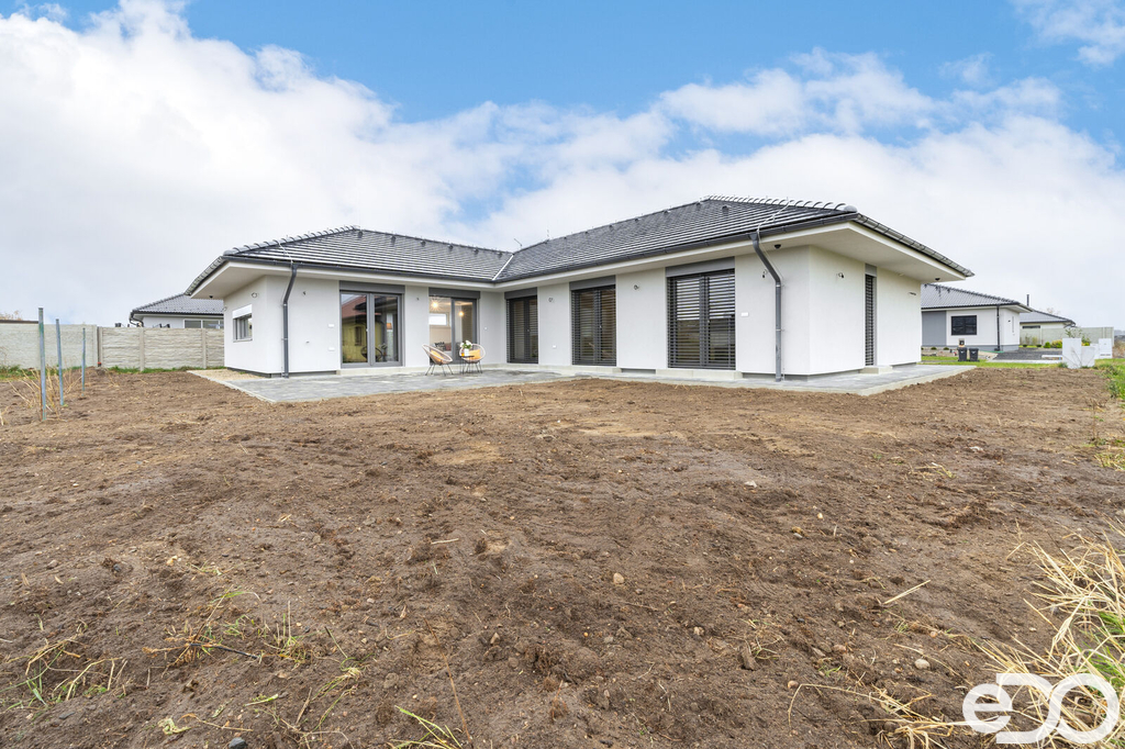 Skvělá dispozice domu nabízí prostorný obývací pokoj s kuchyňským a jídelním koutem, kde se nachází na míru vyhotovená designová kuchyňská linka včetně špičkových spotřebičů francouzské značky DE DIETRICH: trouba, mikrovlnná trouba, varná deska, integrovaná digestoř v horní skříňce, plně integrovaná myčka a lednice s mrazákem. Ze strany kuchyně i obývacího pokoje je aplikována betonová stěrka a stěna je připravena na umístění jídelního stolu. Z velkolepého obývacího pokoje je vstup na venkovní terasu, kde si budete v klidu a pohodě užívat slunných dnů. V domě se dále nachází samostatná část zahrnující ložnici se šatnou a menší koupelnou se sprchovým koutem a toaletou, dva dětské pokoje, velká koupelna s vanou a toaletou a další místnost využívaná jako šatna nebo prádelna. Dostatečné prosvětlení ložnice a dětských pokojů zajišťují dvoukřídlová francouzská okna. Okna a dveře jsou plastová, zasklená izolačním trojsklem. Vytápění je zajištěno tepelným čerpadlem, v celém domě je teplovodní podlahové topení. Velkou přidanou hodnotou tohoto domu jsou venkovní žaluzie dělané na míru, které využijete ve dne i v noci a které chrání vaše soukromí a vytváří příjemné prostředí. Garážová vrata mají inteligentní pohon ovládaný mobilní SmartHome aplikací SOMweb. Dům je vybaven zabezpečovacím a kamerovým systémem JABLOTRON. Přívod pitné vody vodovodní přípojkou, kanalizační přípojka tlaková a dešťová akumulační jímka. Dům má valbovou střechu, s pochozím půdním prostorem. Venkovní povrch v okolí domu je řešen betonovou zámkovou dlažbou, která se nachází jak na zadní terase, tak na parkovacím stání před garáží a na chodnících kolem domu.