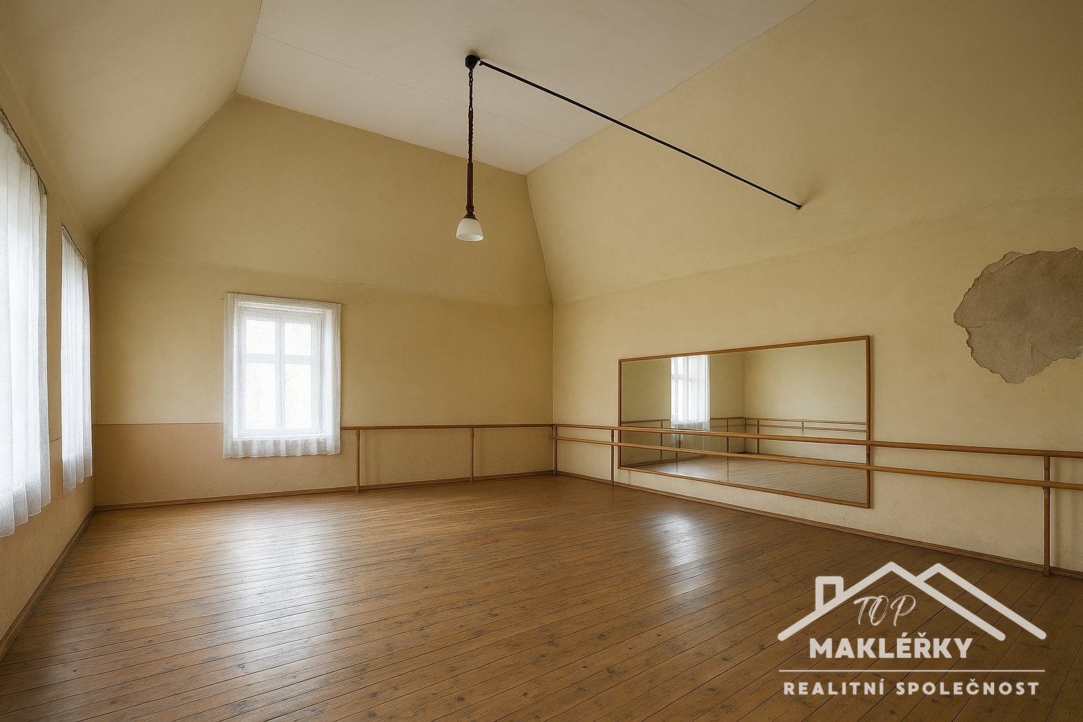 nejen, že tu je zázemí kutilské, ale je tu i původní taneční sál. Ten má výměru cca 70m2. Nabízím vedle fotografie sálu i dvě možné vizualizace. Jeden návrh nabízí prostor jako taneční sál a druhý návrh ukazuje, jak by sál mohl využít jako samostatná jednotka k bydlení s vlastním vchodem. Dejte domu nápad :-)