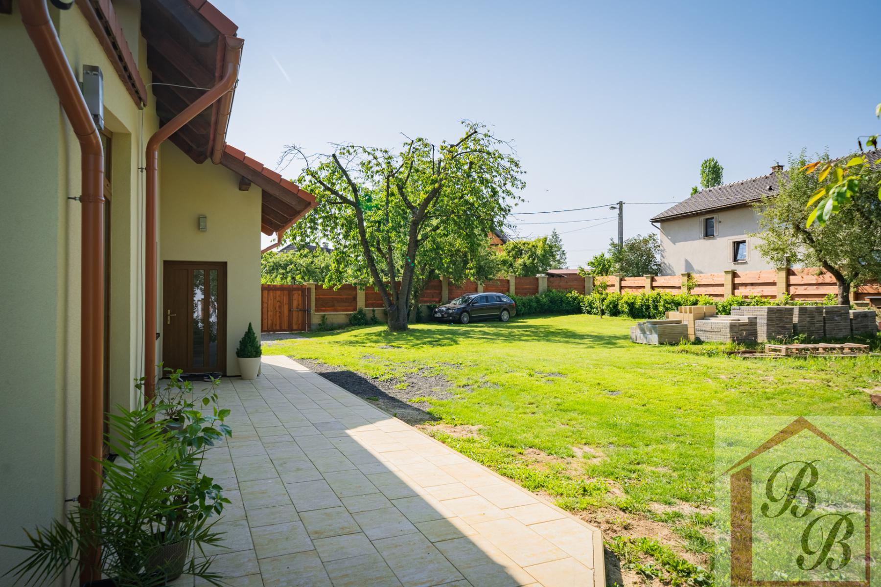 Kolem domu se nachází slunná zahrada, která díky své velké rozloze poskytuje dostatek místa na vybudování zázemí pro mnoho rodinných aktivit i příjemnou relaxaci v krásném prostředí. Na zahradě je prostorná garáž a je zde příprava plochy několika parkovacích stání, na jejíž dokončení je na pozemku složená stejná zámková dlažba, ze které jsou již nyní hotové zpevněné plochy a terasa kolem domu. Vjezd na pozemek je elektrickými vraty na dálkové ovládání.