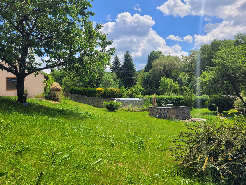 Z domu je velkým posuvným portálem výstup na dlážděné zpevněné plochy s pohodlnou terasou, která nabízí pěkný výhled. Zahrada se pyšní velkou mírou klidu a soukromí a nabízí ideální podmínky pro pěstování, a to nejen díky skleníku, zemnímu sklípku a mírné jižní svažitosti. Pozemek se vzrostlými ovocnými stromy a příjemným prostorem pro relaxaci u ohniště je ohraničen potokem, ke kterému je přímý přístup. Přítomnost bazénu, parkovacího stání a zahradního domku přispívá k komfortu a zábavě na čerstvém vzduchu.