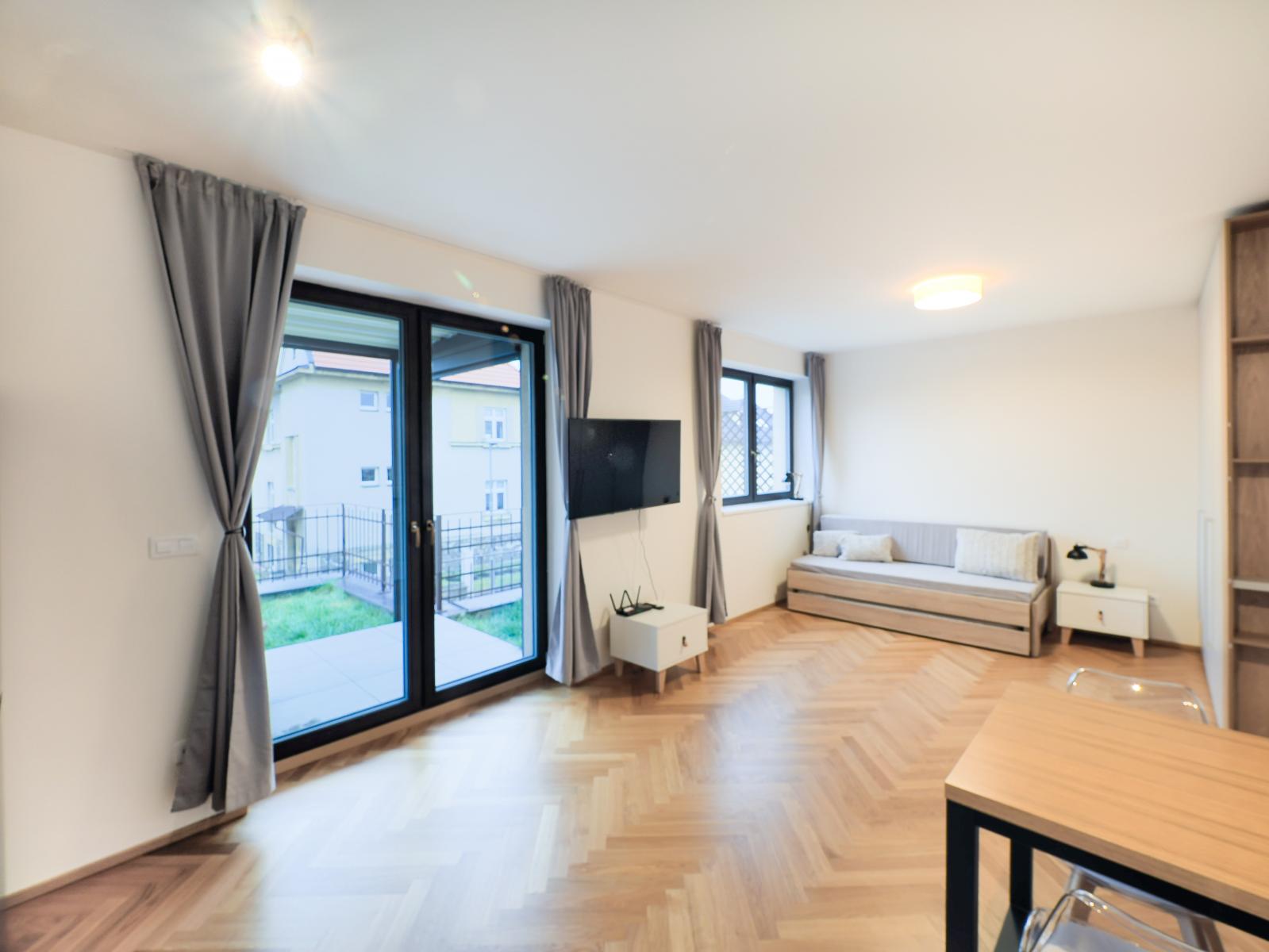 Výjimečné místo k životu i rekreaci v blízkosti historického centra Tábora! Atraktivní byt s rozsáhlou terasou, garážovým stáním a výhledem na vilovou čtvrť v Táboře, které je součástí. V nově postaveném domě o celkovém počtu 8 bytových jednotek v Bechyňské ulici v Táboře, nedaleko Kotnova a historického centra města Vám nabízíme ve druhém nadzemním podlaží ke koupi byt o velikosti 38 m2, v počtu místností 1 + kuchyňský kout, vstupní chodba, sociální zařízení. Na byt navazuje prostorná dlážděná terasa s další zatravněnou plochou o výměře 20 m2. Terasa je krytá pergolou se zařízením na ovládání zastínění ze všech stran i stropu, která vytváří možnost dalšího využitelného prostoru k posezení i odpočinku. Unikátní terasa a travnatá plocha je jako stvořená pro útulné venkovní posezení, relaxaci, slunění, cvičení nebo malé zahradničení. Kuchyně je vybavená kuchyňskou linkou včetně spotřebičů (lednice, myčka, kávovar Philips, elektrická trouba, varná deska). V prostorné koupelně je sprchový kout, umyvadlo, WC, pračka se sušičkou ( kombinace). V obývací části a vstupní chodbě jsou prostorné vestavěné skříně k uložení osobních věcí. Podlahovou krytinu tvoří parkety. Byt se prodává včetně zařízení tak, jak je zobrazeno na fotografiích. K bytu dále patří sklepní prostor v prvním podlaží. V domě je výtah, plynová kotelna Buderus s akumulační nádrží na teplou vodu, bytová jednotka je napojena na vodovod a elektřinu. Pohodlné parkování na vlastním garážovém stání v 1. nadzemním podlaží, které je dostupné výtahem přímo z patra bytu, je za cenu 900.000,- Kč a je podmínkou koupě bytu. Na prostorném parkovacím místě o velikosti 1 + 1/2 klasického parkovacího stání zaparkuje nejen osobní automobil, ale dále i například dva motocykly. Vjezd je zabezpečen automatickými dálkově ovládanými vraty zn. Hormann. Nízké náklady na bydlení včetně energií činí 2.921 Kč + elektřina ( v současné době je záloha nastavena na 740 Kč/měs.). Veškerá občanská vybavenost se nachází v bezprostřední blízkosti domu v centru Tábora. Obchody, restaurace, historická část města, zastávka MHD, na druhé straně příroda, řeka Lužnice, lesopark Pintovka, Tismenické údolí s příjemnou procházkou do Klokot, vše v pěší dostupnosti během několika minut.