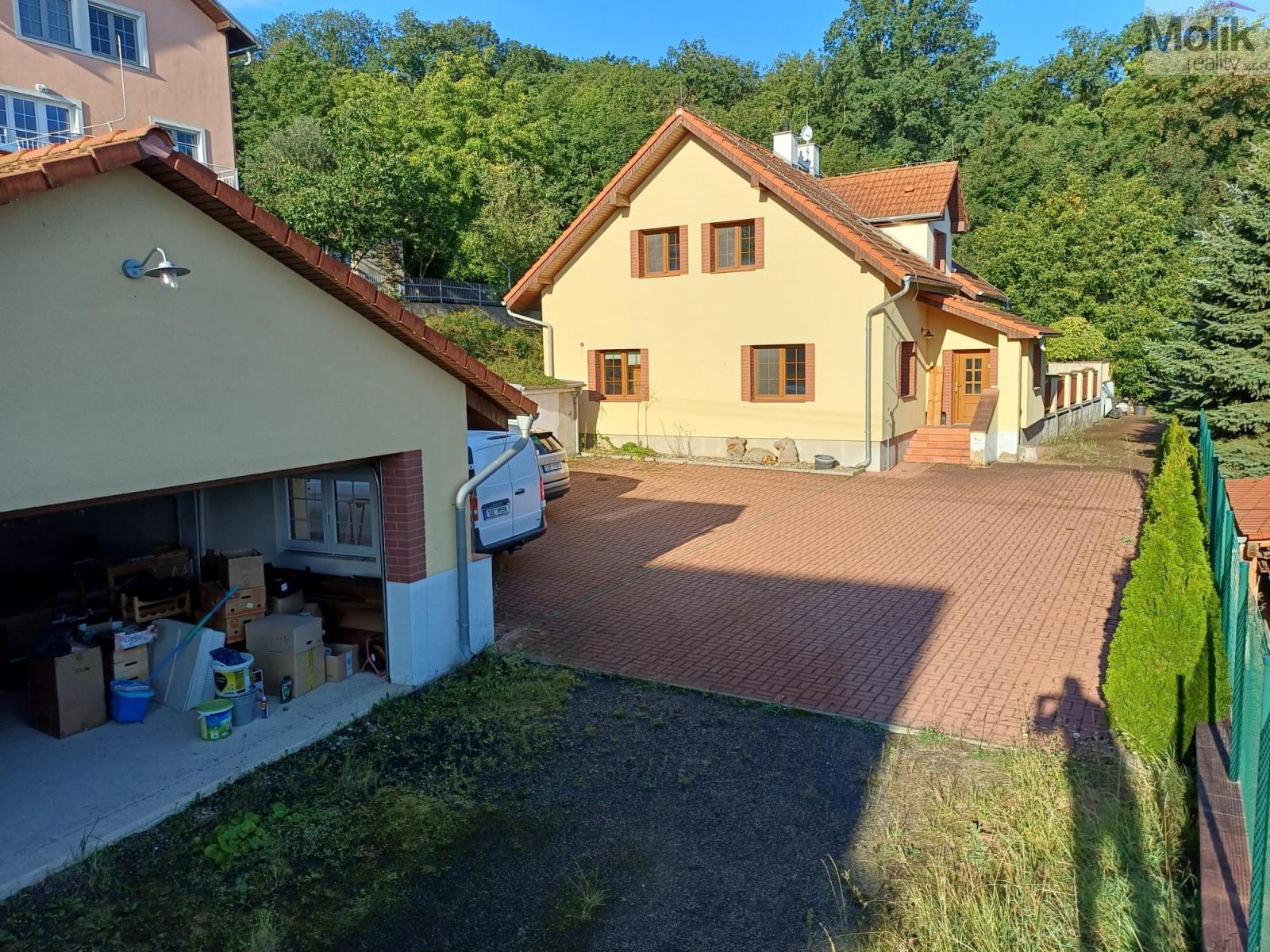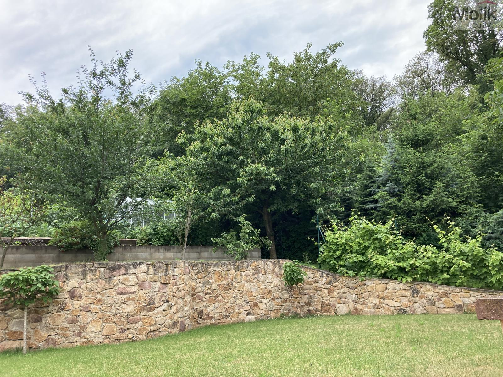 K nemovitosti náleží zahrada s travním porostem a okrasnými dřevinami, která z jedné strany navazuje na místní lesopark a tím poskytuje větší klid a soukromí než jiné nemovitosti v této lokalitě. Na pozemku se dále nachází dvougaráž (54 m2), zpevněná/vydlážděná plocha na parkování dalších až 6 automobilů, zastřešená venkovní terasa, zděný zahradní domek s letní kuchyní a sklípek.