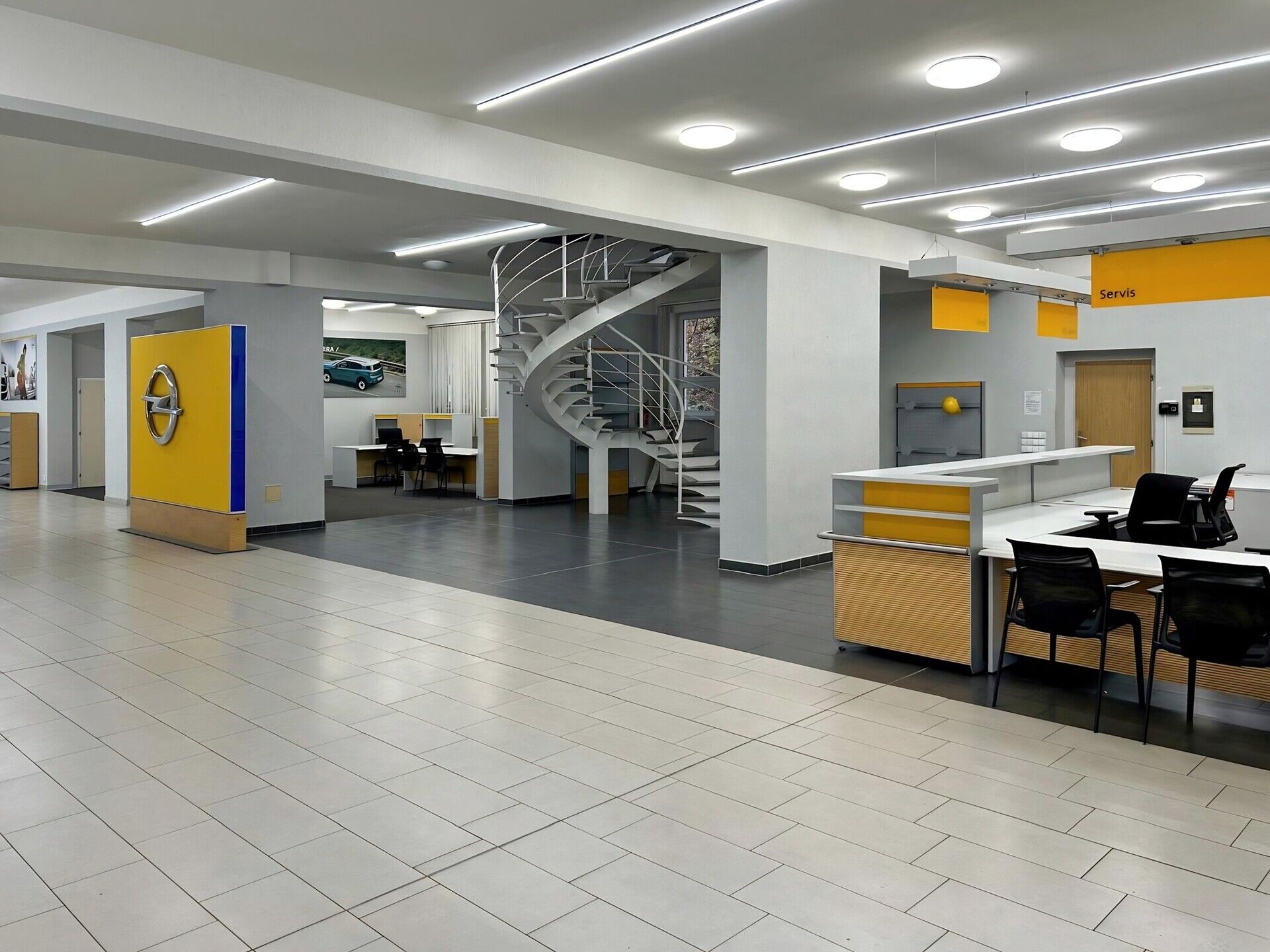 Dispozice přízemí: showroom, navazující zázemí pro občerstvení zákazníků a sociální zařízení, servisní dílna se čtyřmi zvedáky a zvedákem s geometrií, s kompletně vybaveným pneuservisem, s měřením emisí pro všechny značky osobních a SUV vozidel, sklad náhradních dílů, kuchyňka pro zaměstnance.