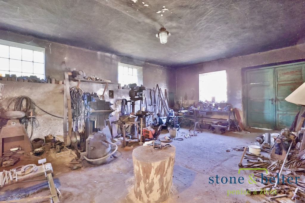Hospodářská část (cca 250 m²): původní kovárna, garáže a chlévy s velkou půdou.