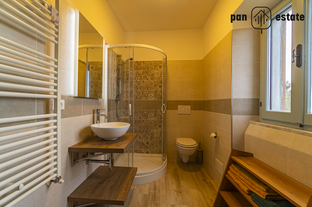 Další zázemí: skladové prostory, samostatná garáž, terasa nad sklady, zahrada s olivovníky, ovocnými stromy a výhledem do krajiny. Celková plocha pozemků cca 850 m²