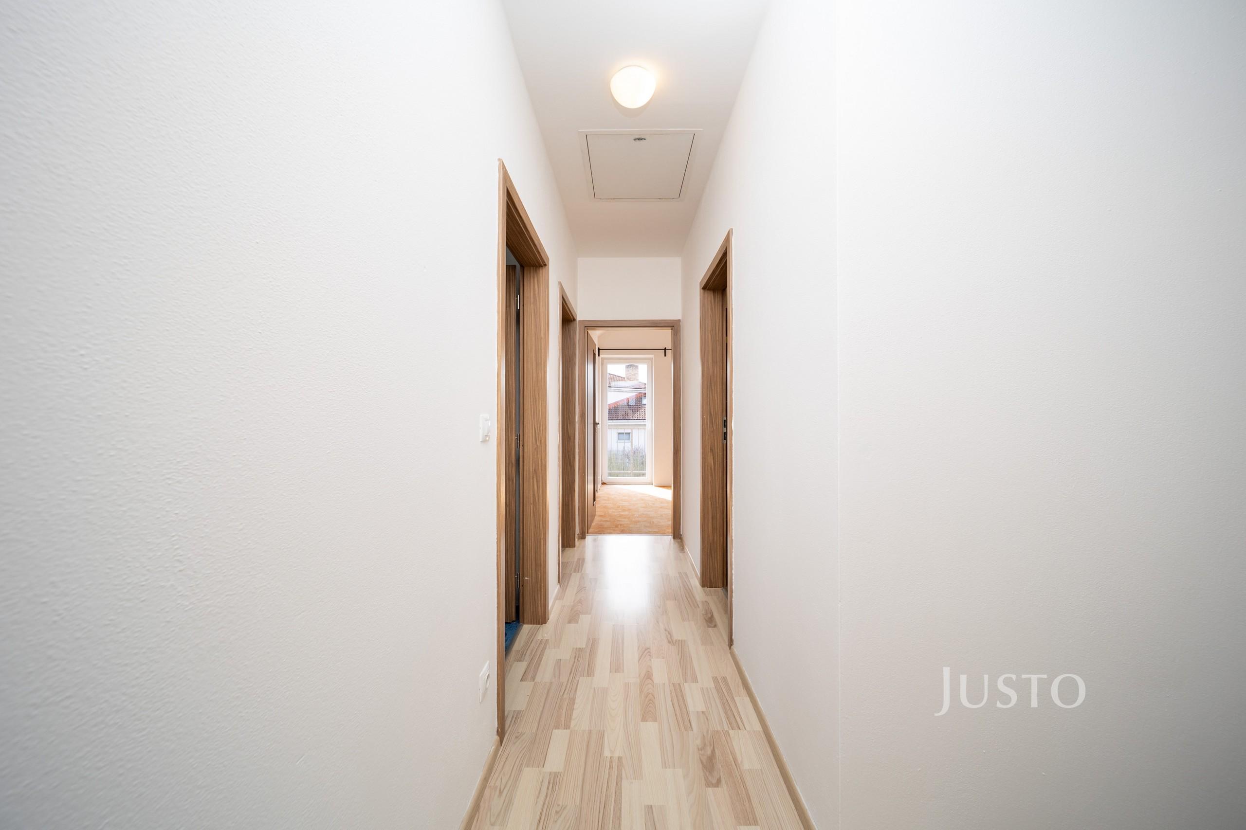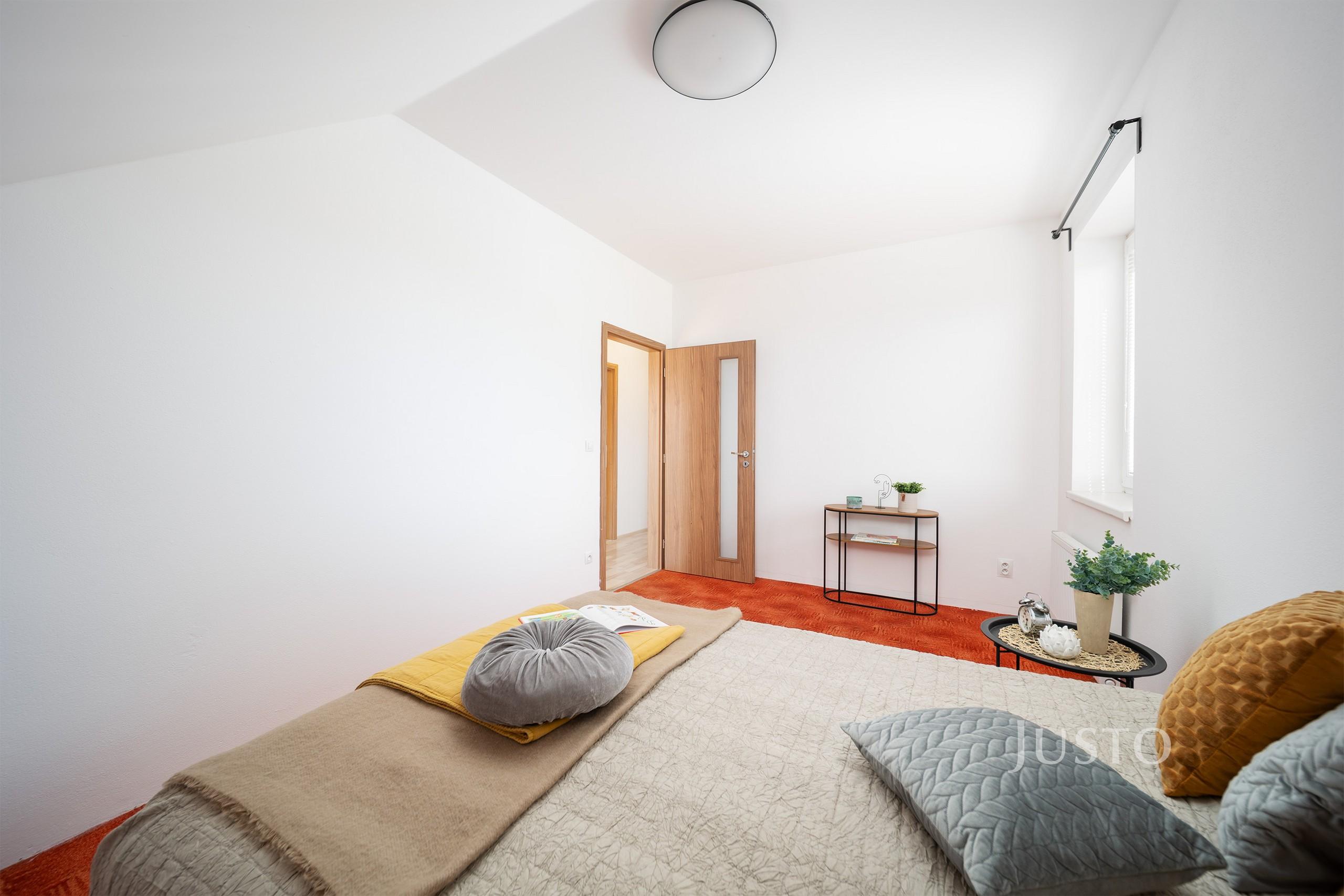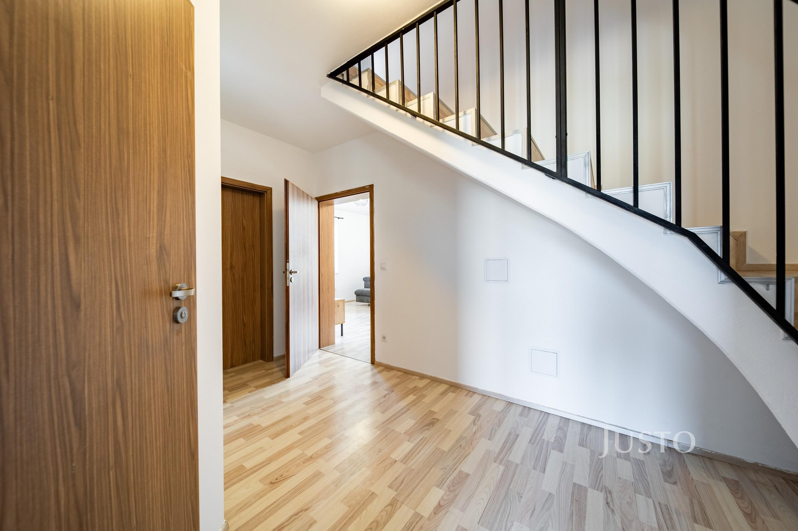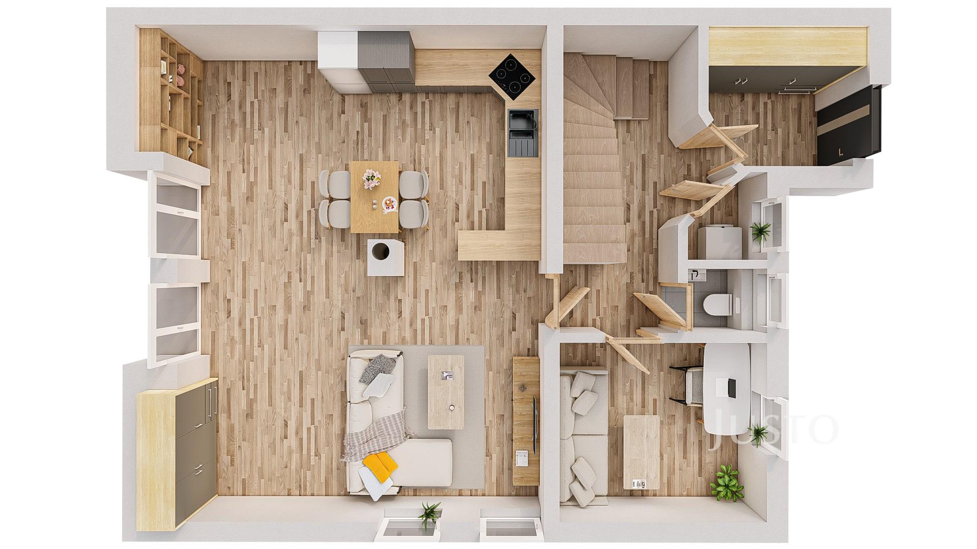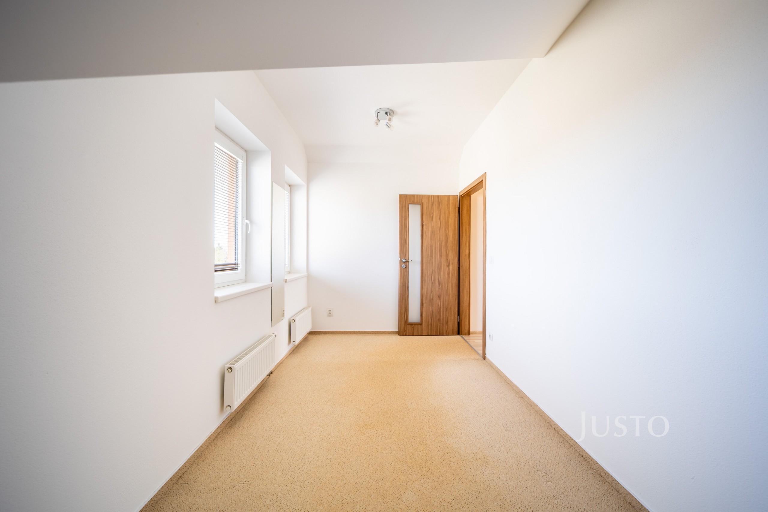 V přízemí se dále nachází samostatný pokoj (9,14 m²), který může sloužit jako dětský pokoj, pracovna nebo zázemí pro hosty. Nechybí samostatné WC (1,38 m²), technická místnost ideální pro umístění pračky a sušičky a vstupní chodba s dostatkem úložného prostoru.