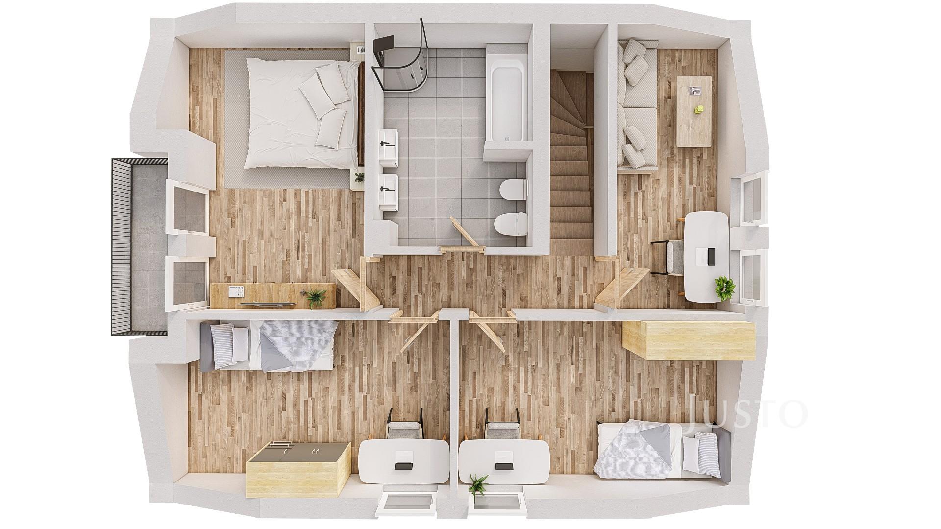 V patře najdeme čtyři samostatné pokoje: ložnici (14,82 m²) s balkonem a výhledem směrem k rybníku, dva pokoje orientované do zahrady (13,74 m² a 13,87 m²) a jeden pokoj (10,21 m²) do klidné ulice. K dispozici je také prostorná koupelna (9,65 m²) s vanou, sprchovým koutem i toaletou.