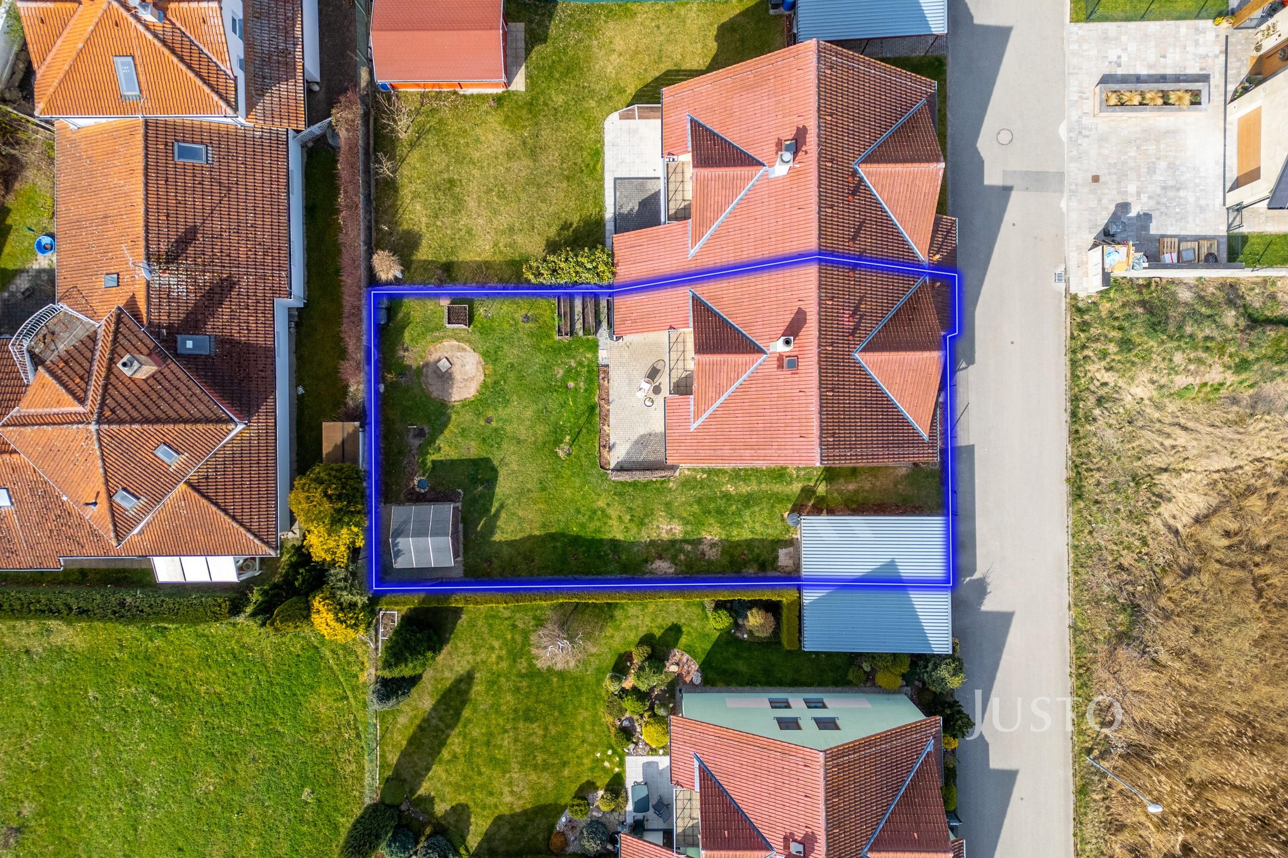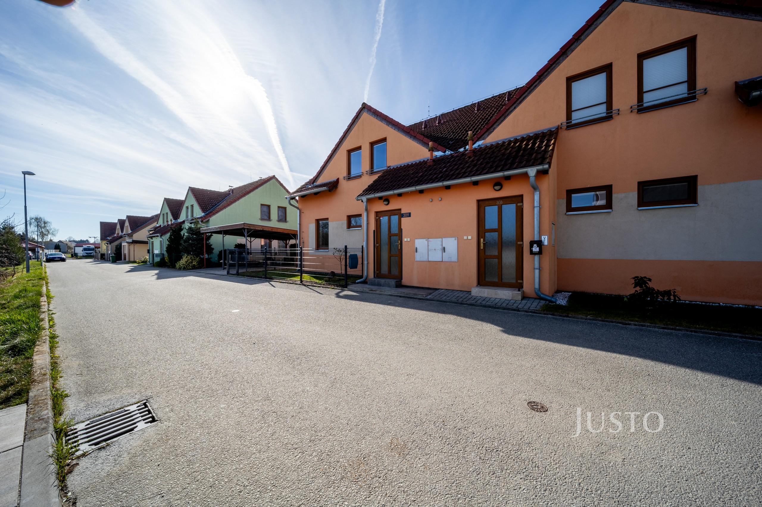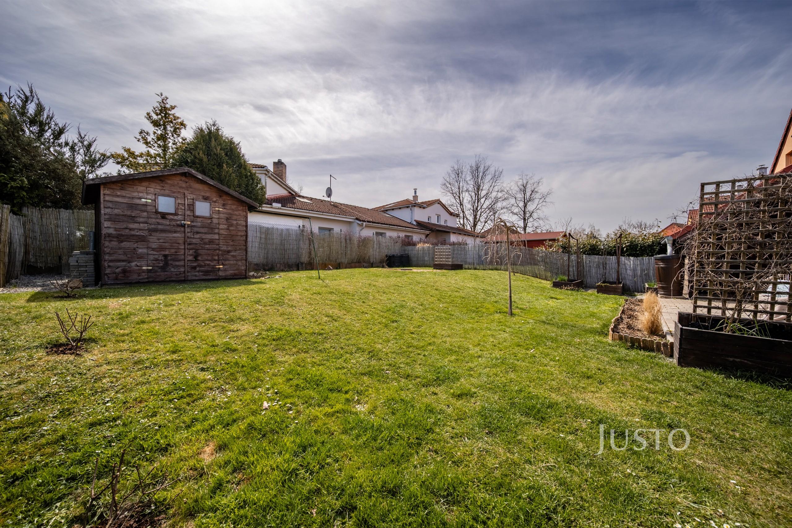 Velkým benefitem je přístup na zahradu – pohodlně pěšky, ale také skrze kryté parkovací stání s možností vjezdu autem přímo na pozemek. Na zahradě se nachází také zahradní domek, ideální pro umístění zahradního nářadí a sekačky.