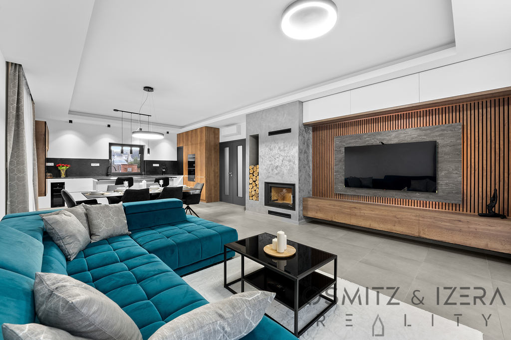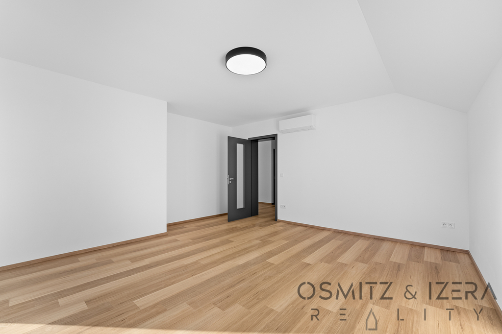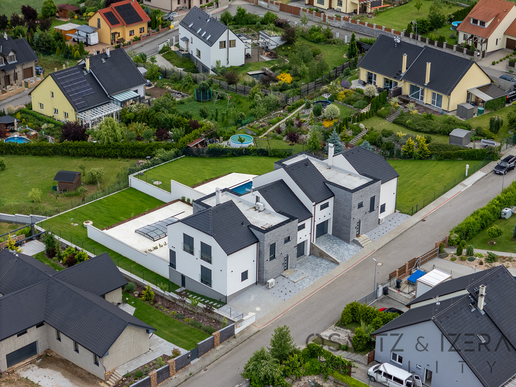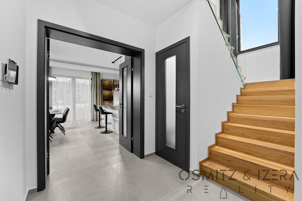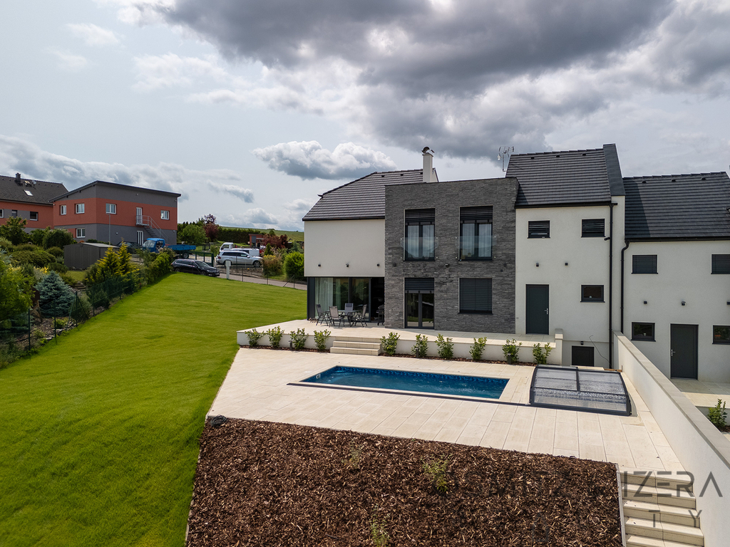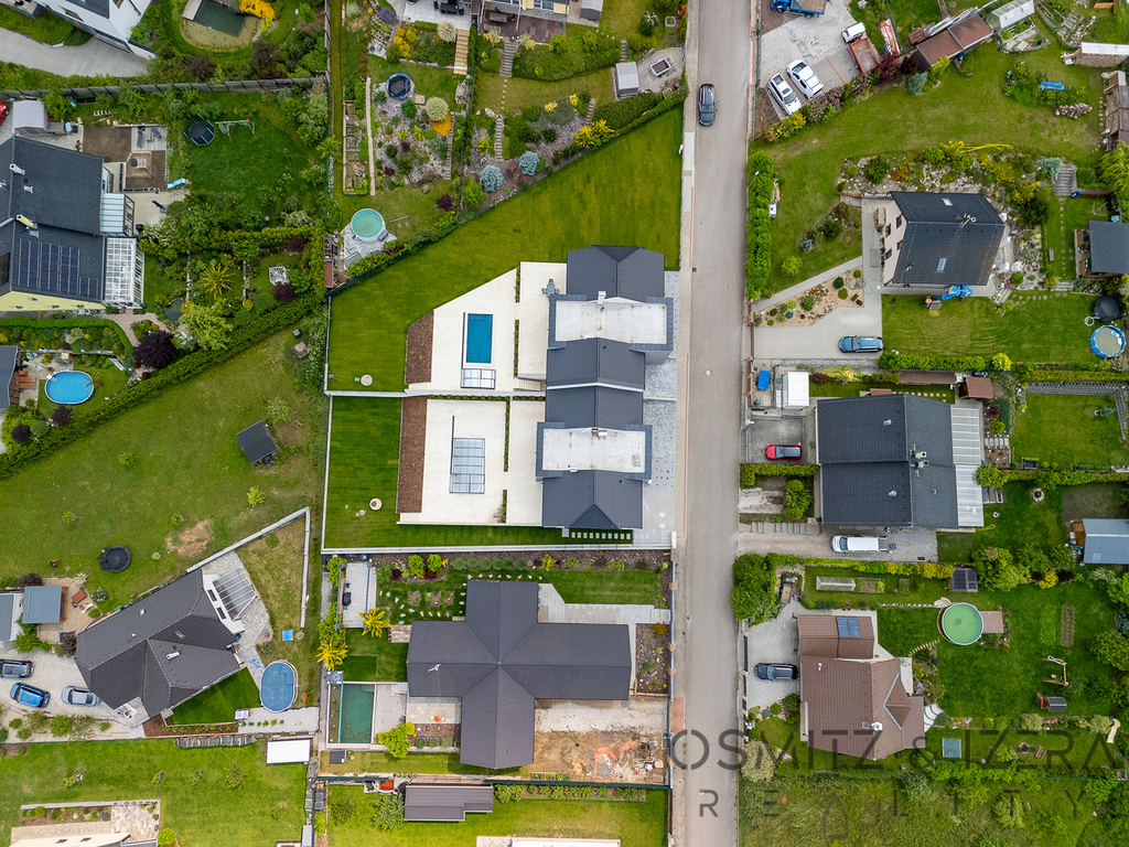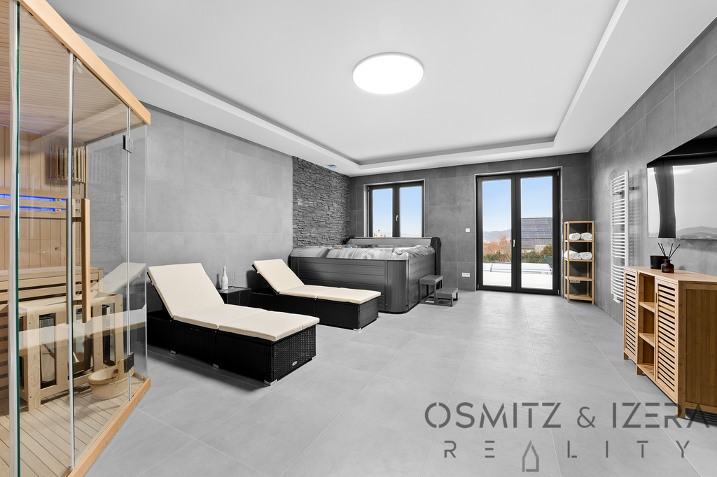 V přízemí domu se nachází prostorný obývací pokoj s kuchyňským koutem, který je ideální pro rodinné setkání a společenské akce. Zde umístěná luxusní kuchyňská linka se spotřebiči značky Siemens nadchne všechny milovníky vaření. K dispozici je také wellness zóna, která zahrnuje vířivku a saunu, což přispívá k relaxaci a odpočinku po náročném dni. Přes velkoformátová francouzská okna je možné vstoupit přímo na stupňovitě sestupující venkovní terasu s krytým bazénem.