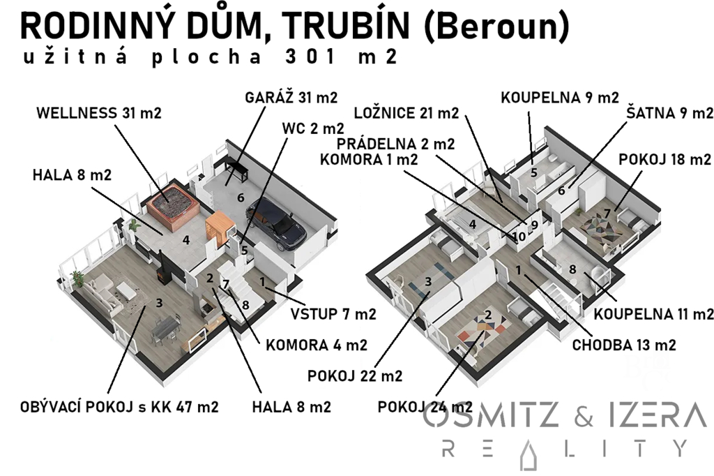 Nabízíme k prodeji exkluzivní luxusní novostavbu rodinného domu, která se nachází v atraktivní části obce Trubín, okres Beroun. Tento úžasný dům vám poskytne dokonalé spojení moderní architektury a komfortu, který splní i ty nejnáročnější požadavky. Celková plocha pozemku je 743 m². Celková užitná plocha dvou podlaží a suterénu domu nabídne neuvěřitelných 301 m². Ideální prostor pro rodinný život a další vyžití.