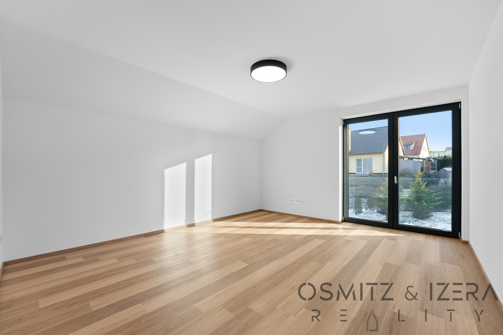V patře jsou umístěny čtyři pokoje, dvě koupelny a šatna, což poskytuje dostatek prostoru pro pohodlné soužití celé rodiny. Z velkých oken je překrásný výhled do údolí a okolní kopce zdejší malebné krajiny.
