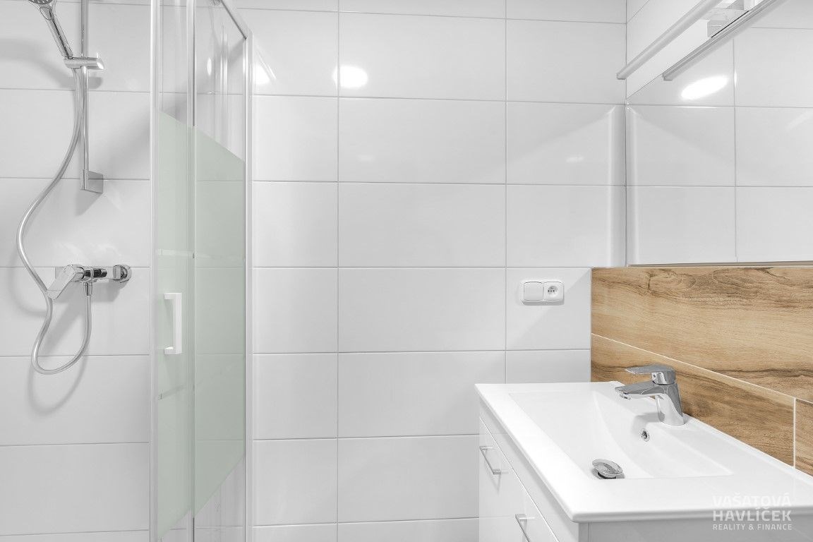 > podlahy – pokoje vinyl, koupelna se sprchovým koutem a s WC dlažba