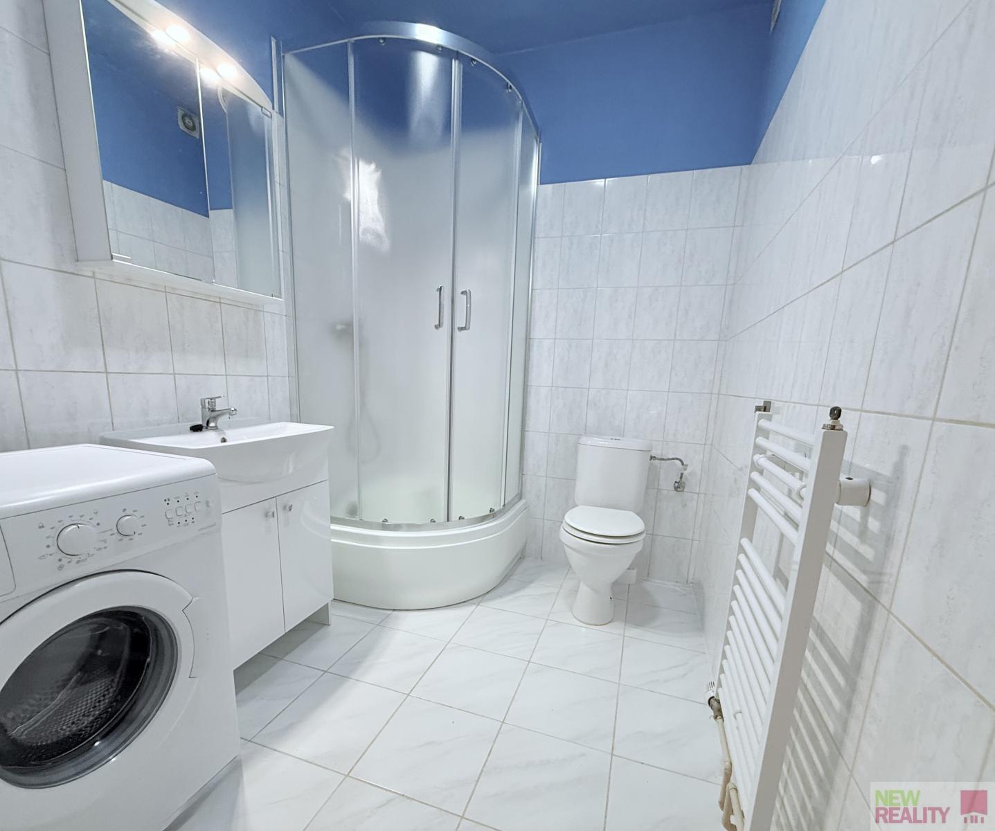 Byt je řešen velmi prakticky. Vstupní předsíň nabízí vestavěnou skříň, věšáky a dostatek prostoru pro umístění botníku. Z předsíně je vstup do koupelny a do hlavní obytné části. Koupelna je ve velmi dobrém stavu, vybavena sprchovým koutem, zcela novou umyvadlovou galerií, toaletou a starší, avšak plně funkční pračkou.