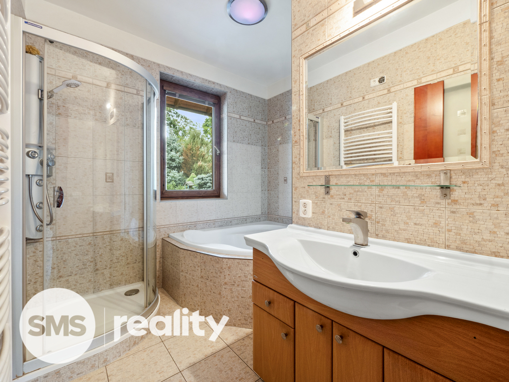 V prvním patře jsou další dva pokoje, koupelna se sprchovým koutem a toaletou a také místnost aktuálně využívaná jako šatna, ve které je připravené připojení pro vybudování kuchyňského koutu. Díky tomu je možné dům jednoduše přizpůsobit pro vícegenerační bydlení.