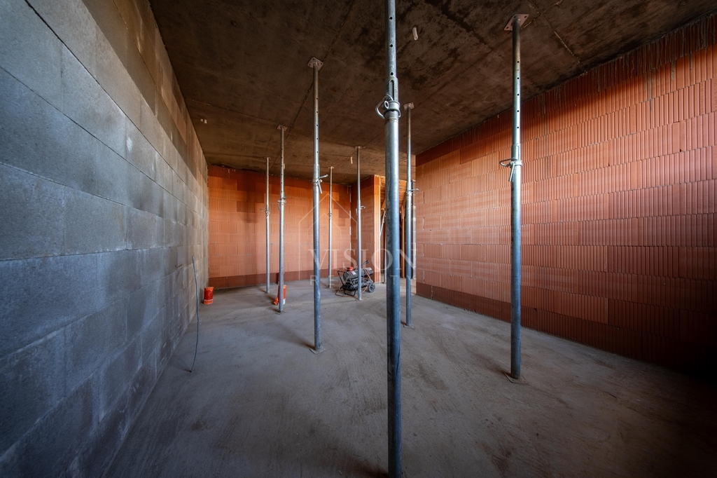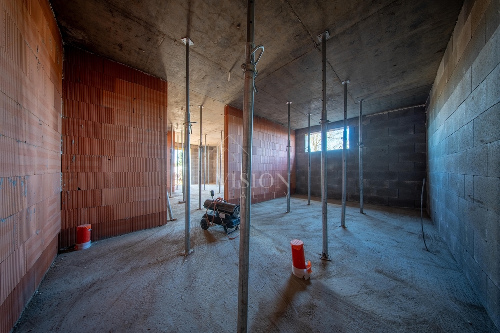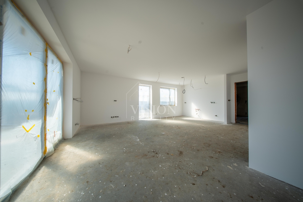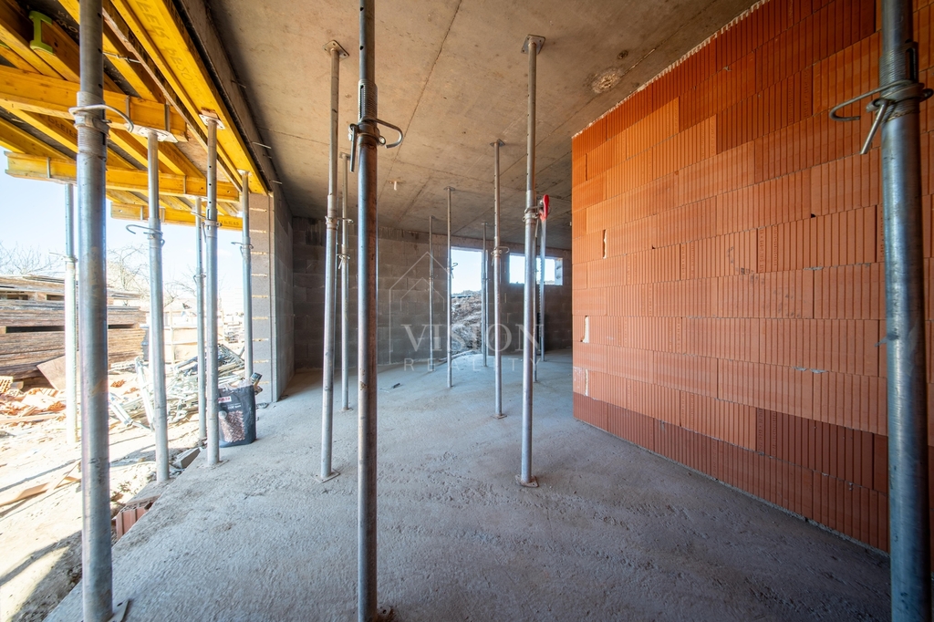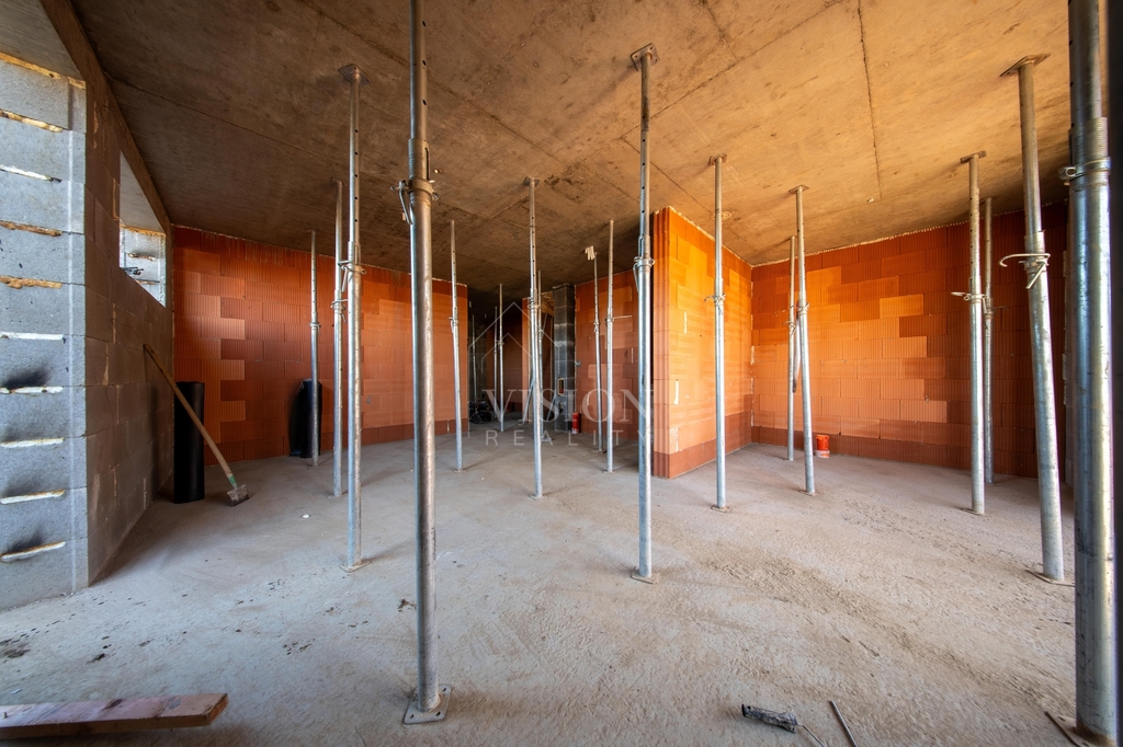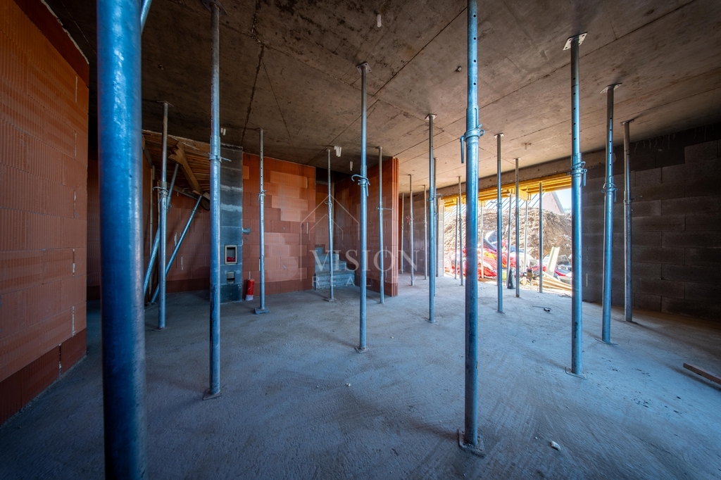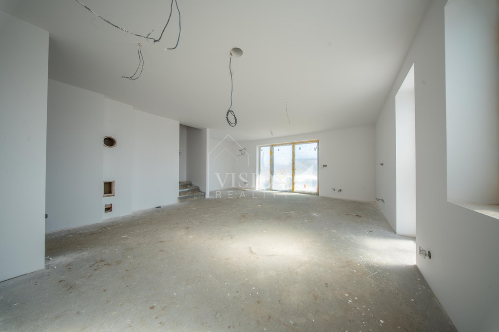 V prvním nadzemním podlaží je taktéž velký obývací prostor s kuchyní z něhož je přímý vstup na balkon. Dále je zde pracovna, samostatná toaleta a technická místnost.