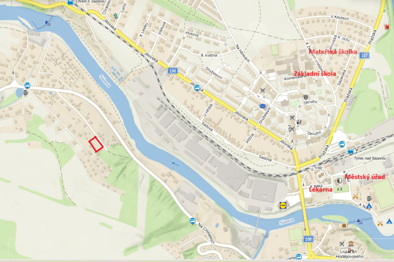 Mírně svažitý terén umožní vybudování suterénu s vjezdem přímo z ulice, ideálního pro garáž, technické zázemí či úložné prostory. Obytná část domu se může krásně propojit se zahradou a z horního podlaží nabídne výhled na údolí Sázavy a město Týnec nad Sázavou.