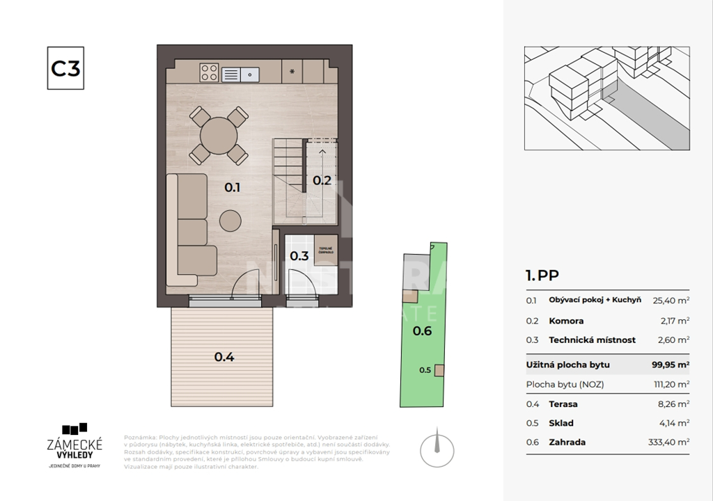 Přízemí – obývací pokoj s kuchyňským koutem (25,4 m2), komora (2,17 m2), technická místnost (2,6 m2), zahrada (333,4 m2), terasa (8,26 m2), sklad (4,14 m2).