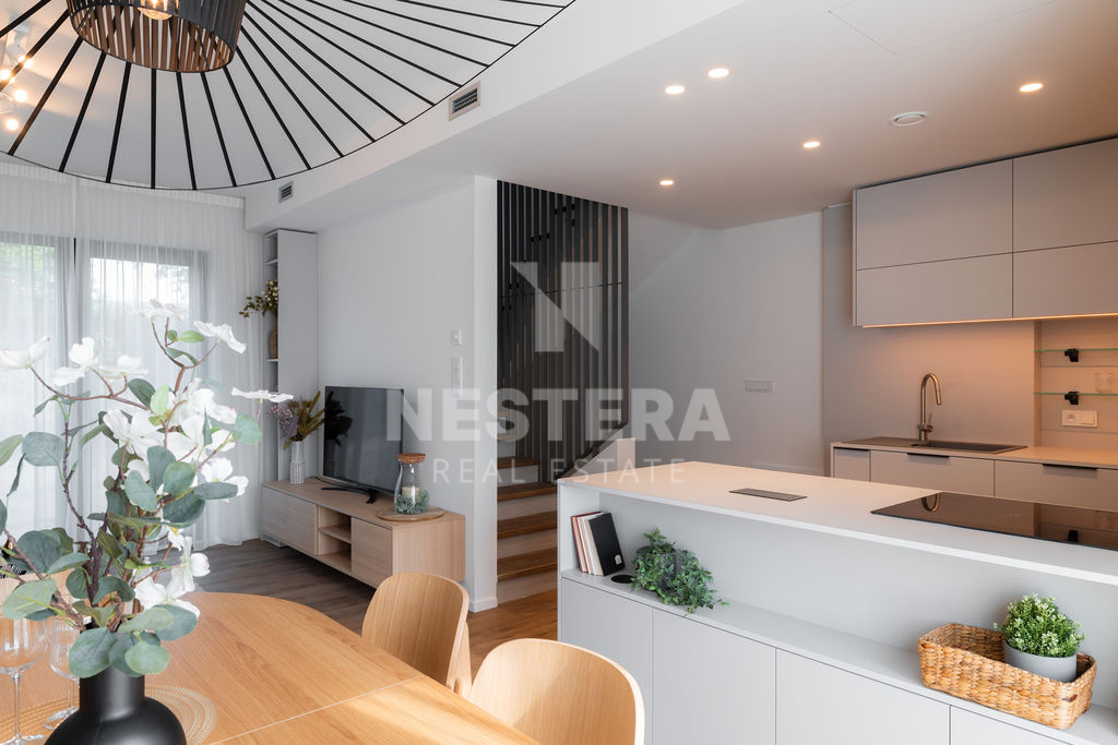 Celková plocha domu 130 m2 (+ zahrada 266,2 m2) a dispozice 4+kk je rozdělena celkem do tří podlaží: