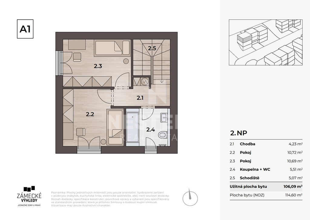 2. NP - pokoj (10,72 m2), pokoj (10,69 m2), koupelna + WC (5,51 m2), chodba (4,23 m2), schodiště (5,07 m2).