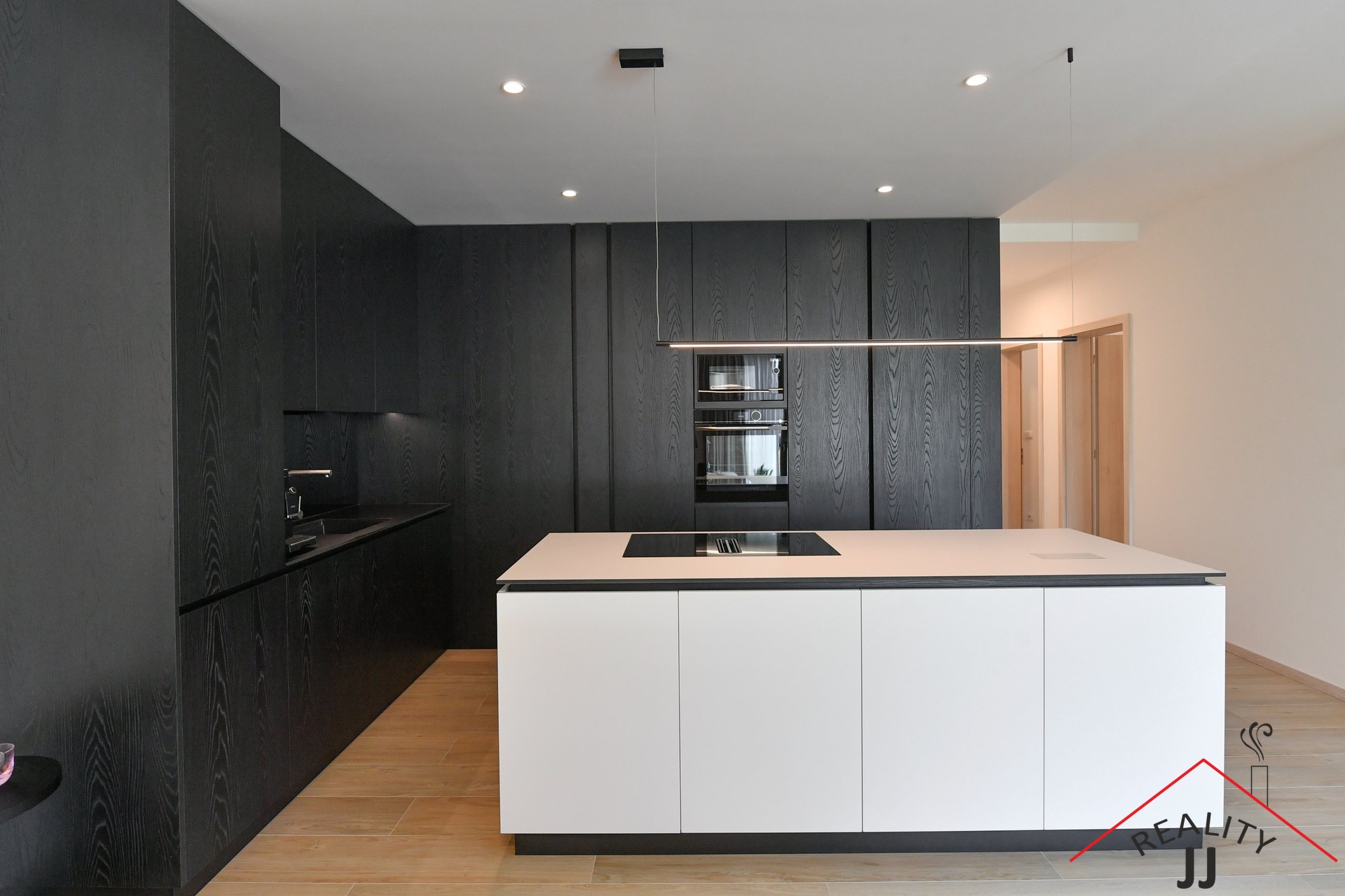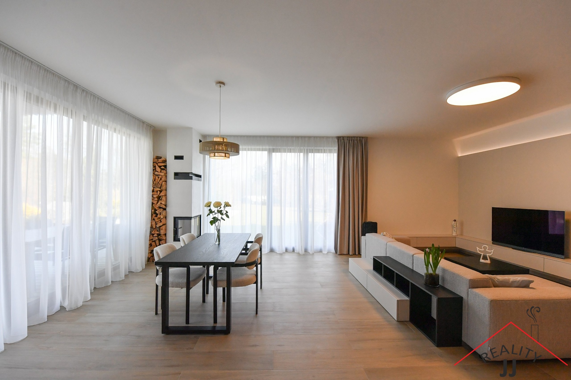 okny a dveřmi a stropy vysokými 2,9 m. V domě najdete luxusní interiér, kuchyň včetně vestavěných spotřebičů značky De Dietrich a tři kompletně zařízené ložnice s vlastními koupelnami.