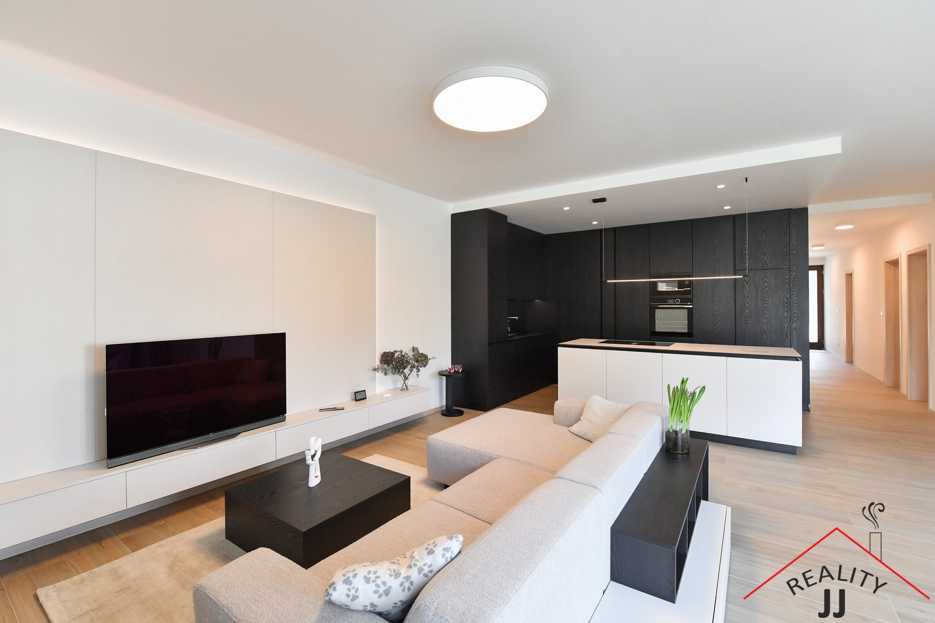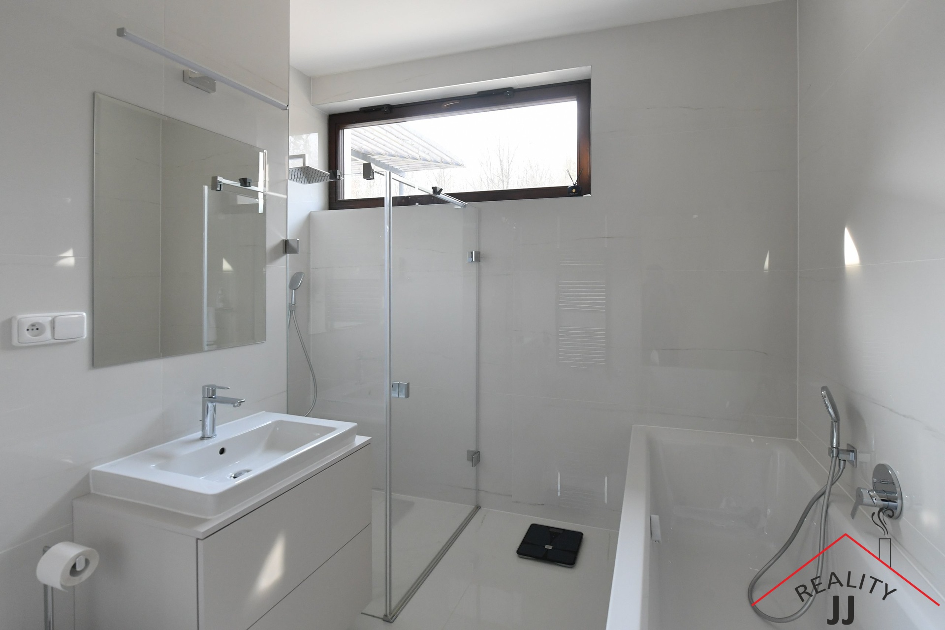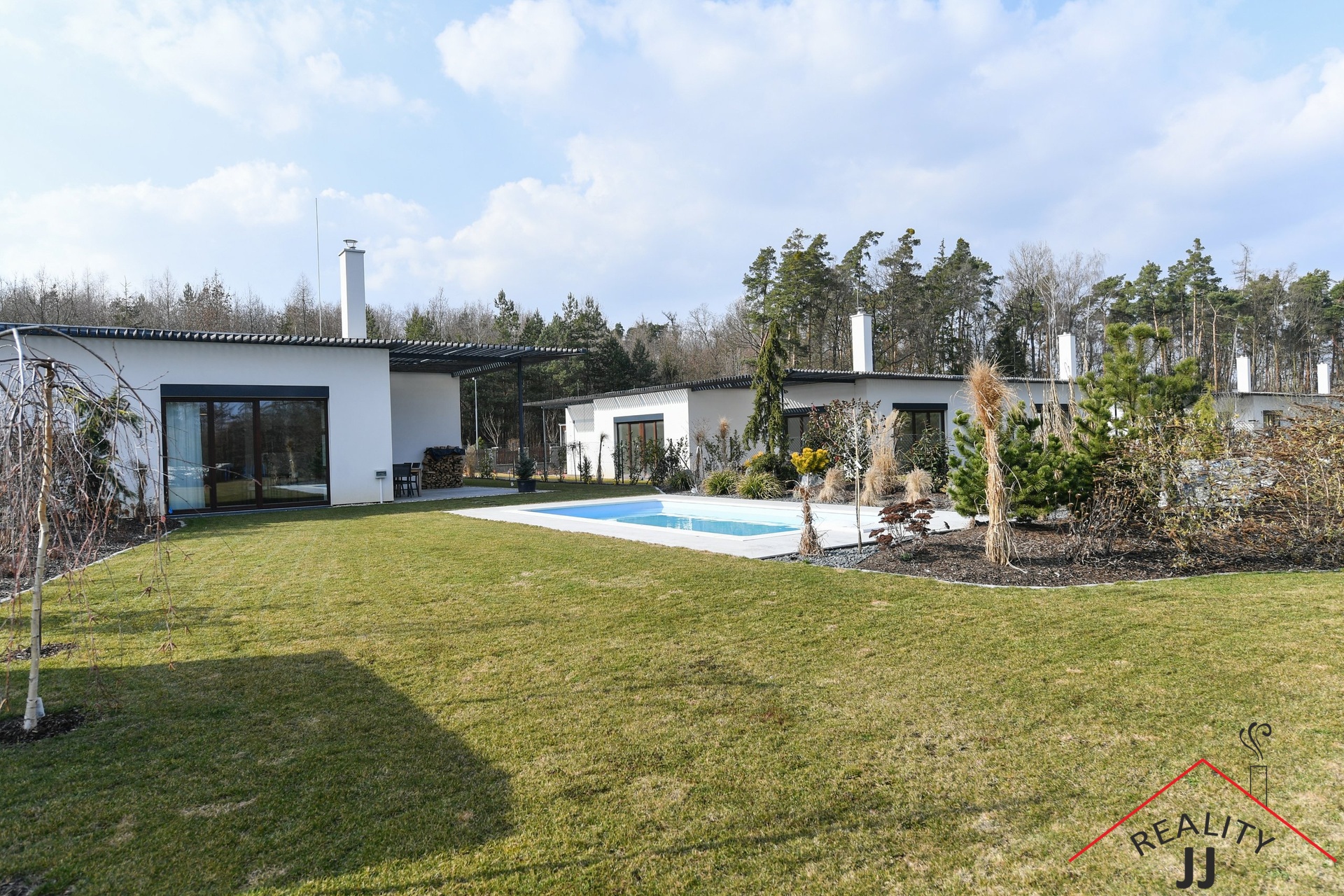 Obytná část chráněná světlolamy ze speciálního odolného dřeva je bezbariérově napojena na dvě terasy s podlahovou krytinou ze stejného materiálu. Terasy plynule přecházejí do nádherné vzrostlé zahrady s bazénem, automatickým zavlažovacím systémem s retenční nádrží pro dešťovou vodu.