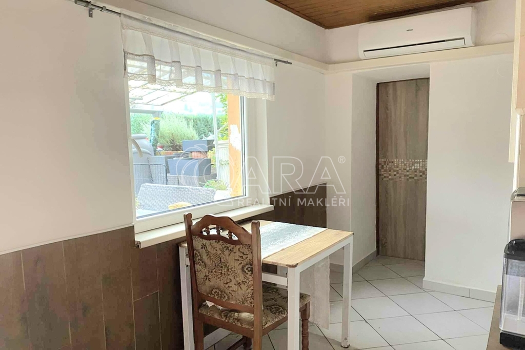 * Přízemí: kuchyně, pokoj, koupelna a další místnost sloužící spíše jako sklep; vstup na prostornou terasu a částečně zasklenou verandu o velikosti 16 m², ideální pro relax a rodinné posezení.
