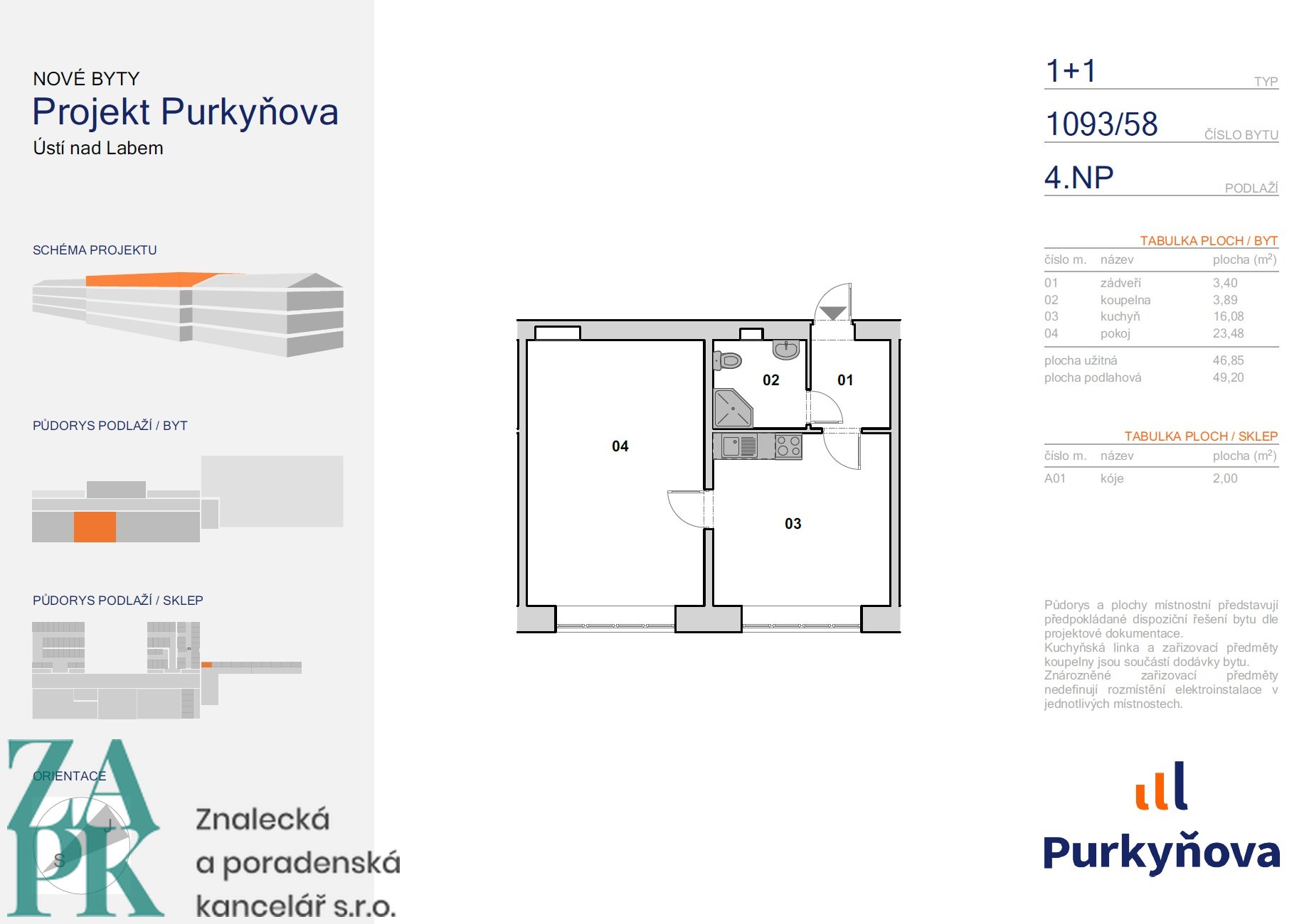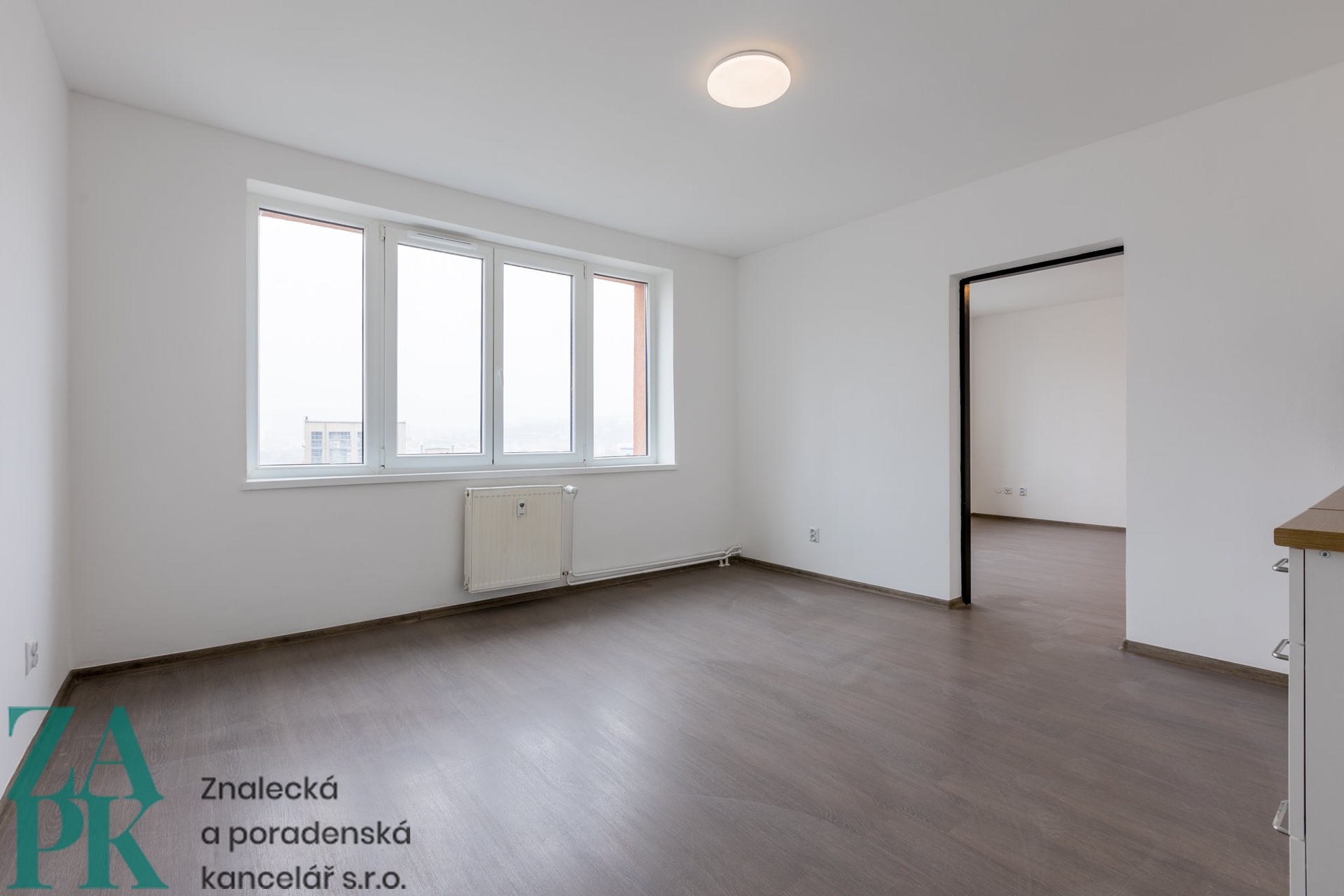 Dispozice bytu - vstupní chodba, koupelna se sprchovým koutem, kuchyň vybavená linkou se spotřebiči a jeden neprůchozí pokoj. Půdorys bytu je k dispozici v galerii. Díky velkým oknům a příznivé orientaci je byt světlý, vzdušný a působí příjemným dojmem.