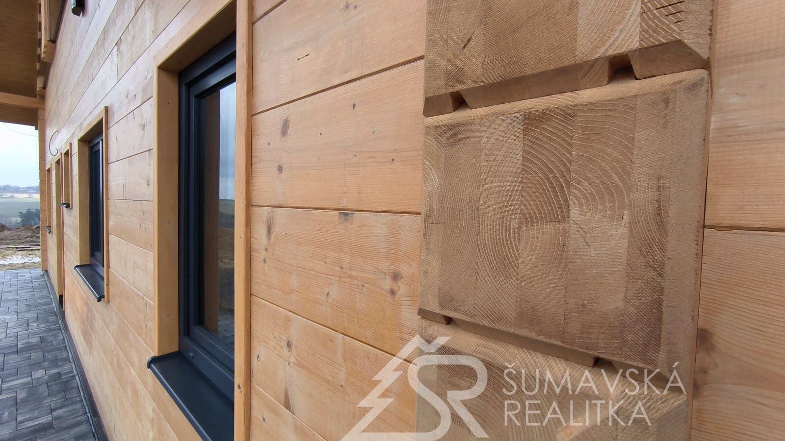 Popis nemovitosti: právě realizovaný rodinný dům je stavěný jako dřevostavba s roubenou obvodovou stěnou z lepených hranolů t.24 cm (bez sedání). Přírodní masivní dřevo je použito i uvnitř domů a vytváří tu správnou atmosféru. Dům je koncipován do tvaru „L“ s vlastní garáží na straně jedné a s velkorysým otevřeným obývacím pokojem s terasou na straně druhé. Uvnitř se nachází dvě ložnice (se šatnou), koupelna, samostatné WC, technická místnost a chodba. Pro užívání je připraveno i podkroví. Střešní krytina je Bramac Tegalit Protector, okna PVC Vekra, sanita od značek Villeroy Boch, Hans Grohe a Riho. Stavba je dokončena s použitím kvalitních standardů (podlahová krytina vinil, vypínače ABB Zoni v černé barvě a bezfalcové dveře). Stejně tak koupelny jsou voleny v materiálech a odstínech k přírodnímu dřevu. Vytápění zajišťuje tepelné čerpadlo Panasonic. Pro případného zájemce se mohou standardy upravit na přání.