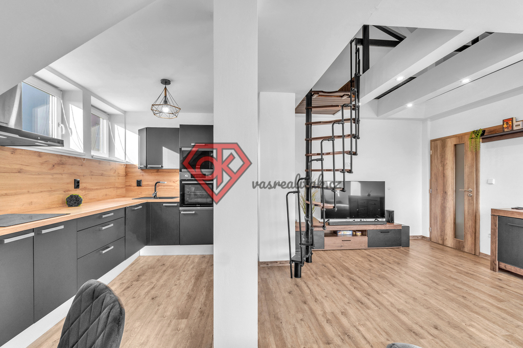 Byt o dispozici 2+kk s galerií nabízí otevřené spaní v patře, kam vás zavede elegantní schodiště přímo z obytné části. Celek působí vzdušně, moderně a přitom útulně. Jedná se o novostavbu cihlového domu a byt je ve skvělém stavu přímo k nastěhování. Nachází se ve 4. nadzemním podlaží domu s výtahem a jeho celková plocha činí 70 m².