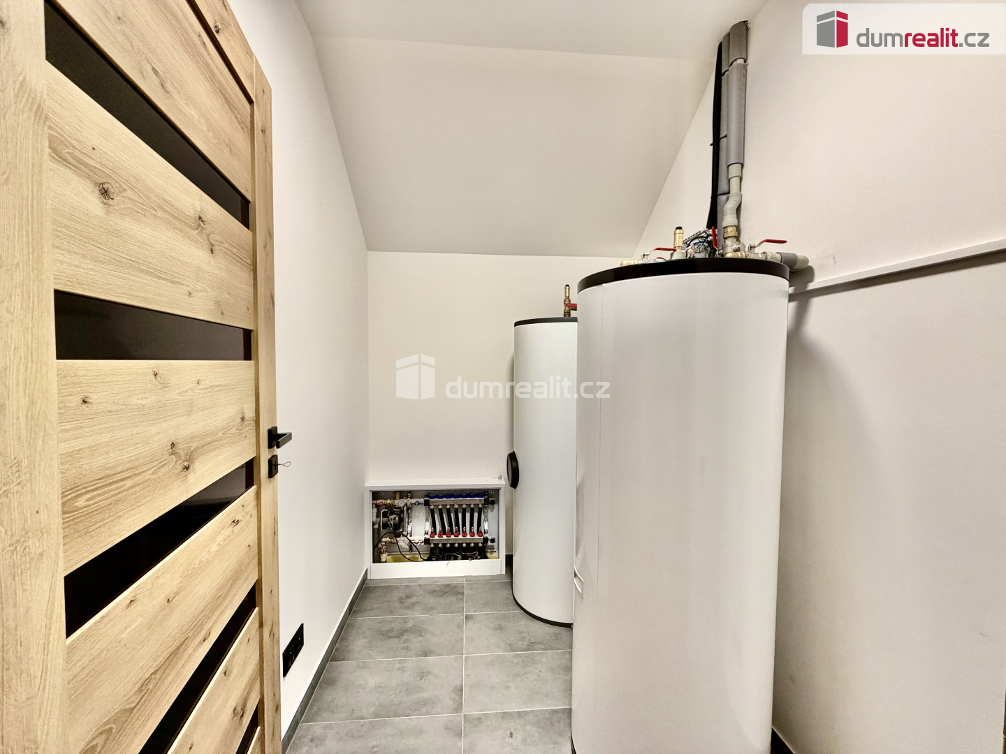 O tepelný komfort a nízké provozní náklady se stará podlahové vytápění napojené na tepelné čerpadlo, okna s trojskly zajišťují výbornou tepelnou i akustickou izolaci. V obytných místnostech jsou položeny kvalitní vinylové podlahy, v zádveří a koupelnách praktická dlažba. Interiér laminátové dveře a zárubně v dřevěném dekoru s černým kováním a moderní zásuvky a vypínače. Velkým benefitem je také instalovaný nerezový komín, který umožňuje bezproblémovou instalaci krbu nebo krbových kamen.