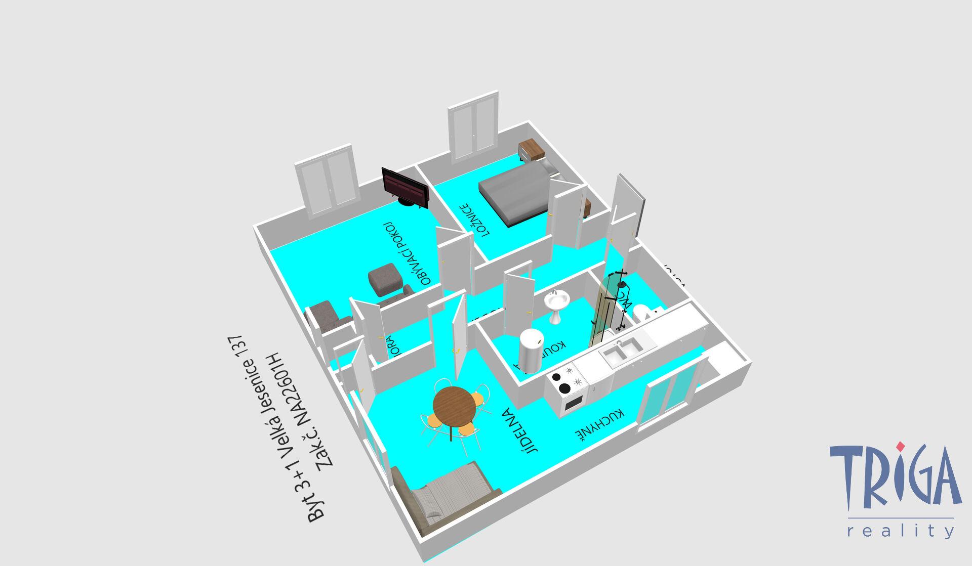 Dispozičně je velmi prakticky řešen: vstupní chodba, samostatné WC, koupelna se sprchovým koutem, komora, kuchyně propojená s jídelnou, ložnice a prostorný obývací pokoj.