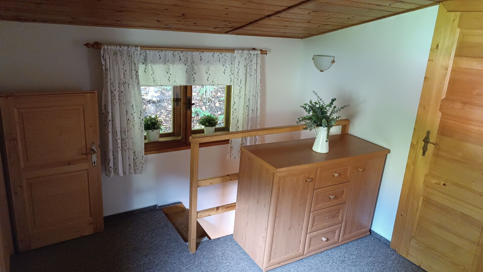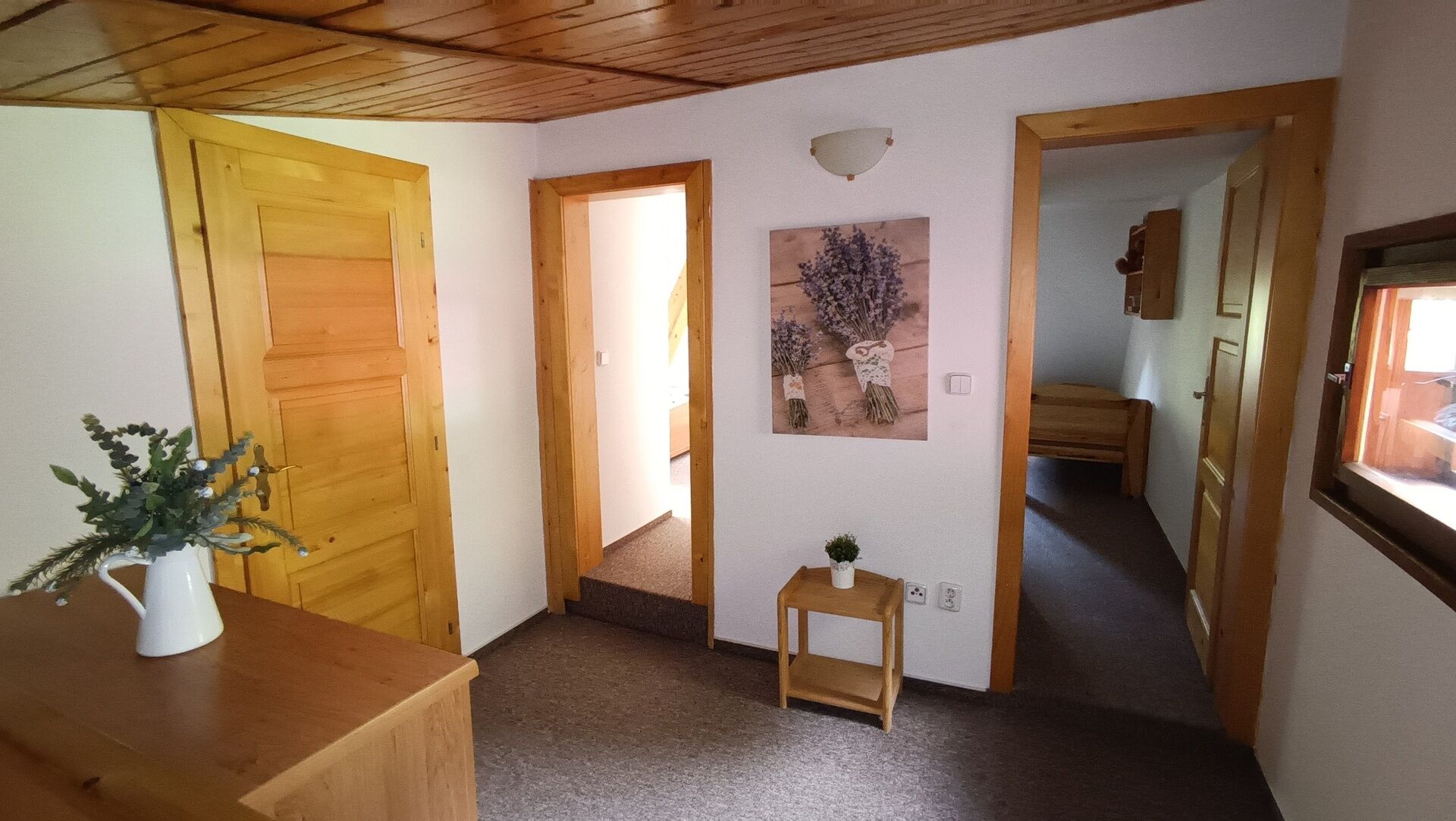 Dispoziční řešení: V 1.NP se nachází veranda, sklad nářadí, koupelna (se sprchovým koutem), WC, sauna (6-8 osob), obývací pokoj s vybavenou kuchyní (trouba se sklokeramickou deskou, lednicí, mikrovlnou troubou, varnou konvicí, toustovačem a vším potřebným nádobím) s jídelnou, která ji propojuje s obývacím pokojem s krbem. V obývacím pokoji jsou dvě prostorná rozkládací lůžka, TV, DVD přehrávač) a schodiště do podkroví. V podkroví: Předsíň, 4 x pokoj (8 lůžek).
