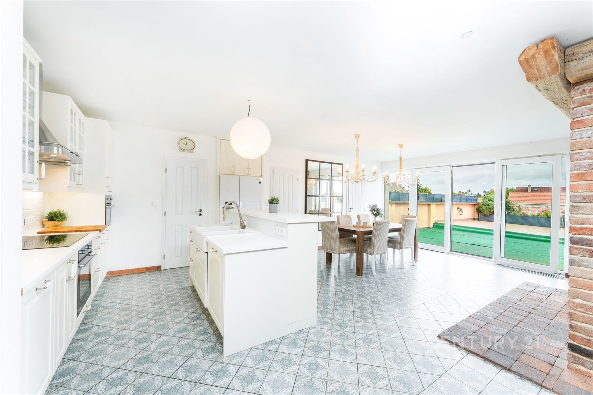 Dominantou interiéru je velký otevřený prostor obývacího pokoje, kuchyně a jídelny s centrálním krbem, který prostoru dodává jedinečnou atmosféru. Právě tady si lze představit klidné večery s rodinou nebo přáteli u praskajícího ohně.