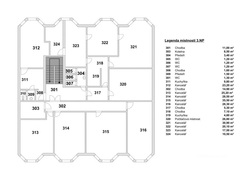 3. nadzemní podlaží (319,3 m²) – prostor pro vybudování prostorných bytových jednotek či investičních apartmánů k dlouhodobému pronájmu.