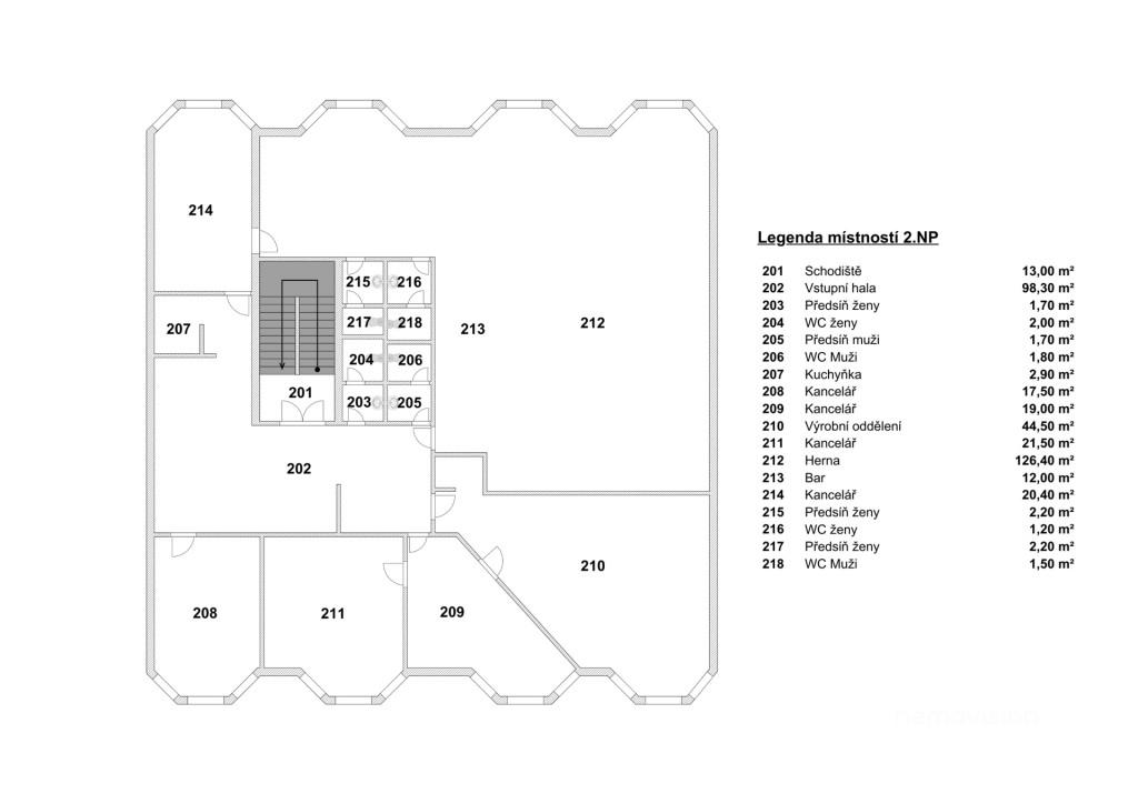 2. nadzemní podlaží (369,4 m²) – vhodné pro kanceláře, coworkingové centrum, sídlo společnosti, školící prostory nebo administrativní část navazující na komerční provoz.