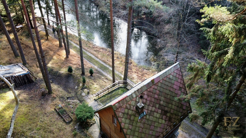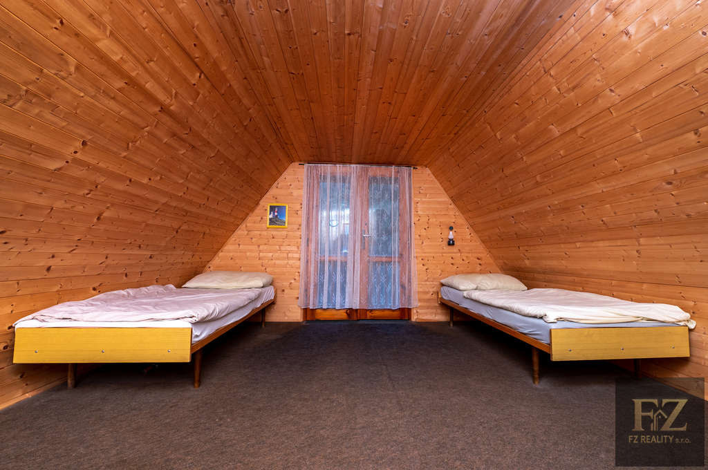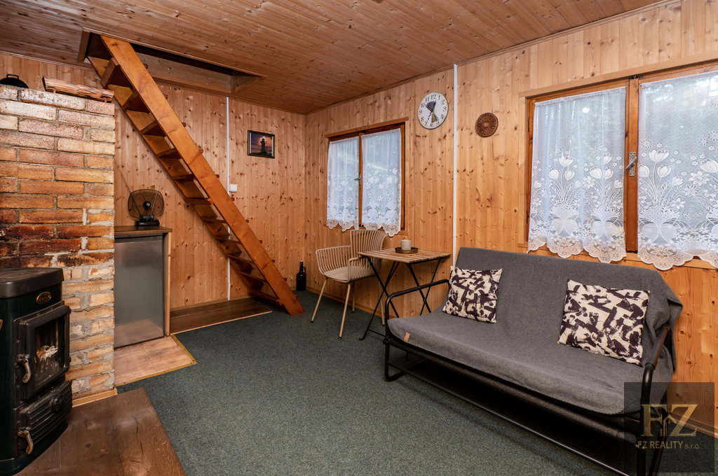 Uvnitř chaty se nachází vstupní veranda, ze které vstoupíte do obývací místnosti s kuchyňským koutem. Součástí vybavení je dřez, lednice a elektrická stolní trouba s plotýnkami. V přízemí se nachází WC s umyvadlem a přípravou na sprchový kout. V patře je ložnice se dvěma lůžky a balkonem s krásným výhledem na rybník a okolní lesy.