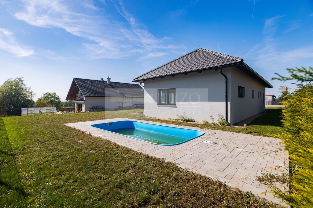 Nemalým benefitem této stavby je její profesionální provedení, zatravněná rovinatá zahrada, bazén a 3D oplocení s podezdívkou.