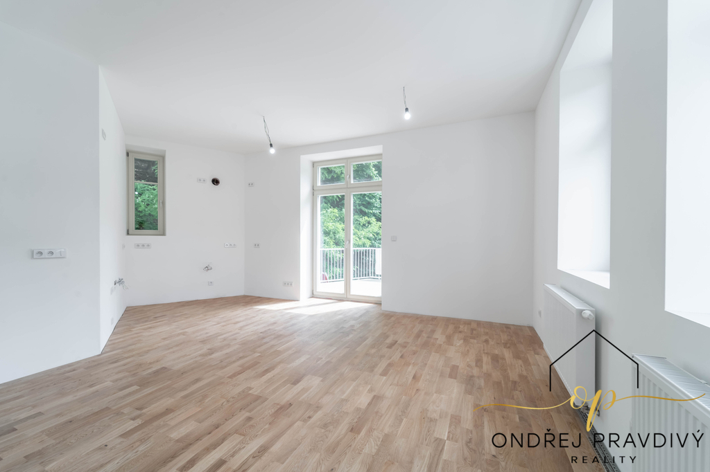 Byt se nachází ve 2. nadzemním podlaží a po kompletní přestavbě domu se může pyšnit nadstandardní kvalitou provedení a použitých materiálů. Provedení zahrnuje dřevěné plovoucí podlahy, dřevěná euro okna s trojskly, designové dlažby a nadčasové obklady. Značková sanita firem Laufen a Hansgrohe. Dále jsou datové rozvody, příprava na zabezpečení a elektromobilitu. Díky zateplení celého domu i vlastnímu kondenzačnímu kotli pro vytápění a ohřev vody budou provozní náklady skutečně příznivé. Orientace na jiho-západ zajišťuje dostatek slunečního světla a vysoké stropy zase pocit vzdušnosti. Příslušenství bytu zahrnuje terasu přístupnou z obývacího pokoje, vlastní parkovací stání a prostorný sklep 11 m² na jakékoliv sportovní či sezónní vybavení.