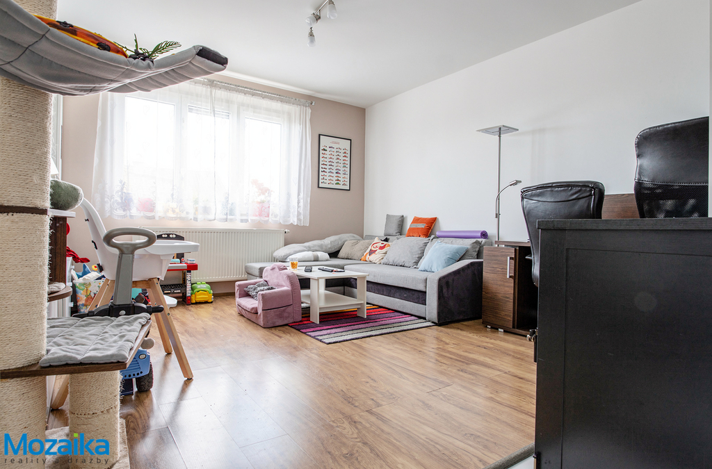 Dispozičně se byt skládá z prostorného pokoje o výměře 19,20 m², menšího pokoje 7,32 m², ložnice, kuchyně 13,20 m², jídelny 5,72 m², předsíně 4,52 m², koupelny 3,90 m² a samostatného WC 0,8 m². Kuchyně je plně vybavena kuchyňskou linkou s varnou deskou a odsavačem par, takže můžete začít vařit hned po nastěhování. K bytu dále náleží dva sklepy v suterénu domu o celkové výměře 7 m², kde najdete dostatek úložného prostoru.
