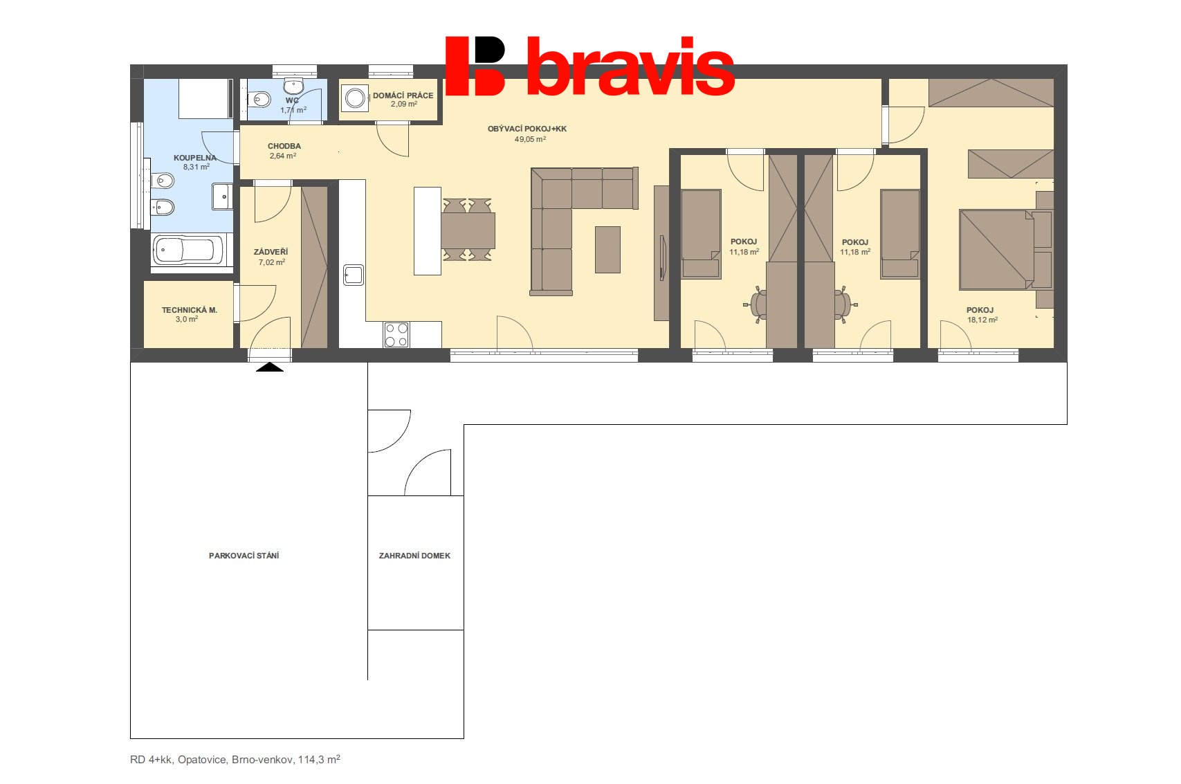 Mimo hlavní obytnou část dům nabízí tři samostatné pokoje (18 m², 11 m² a 11 m²), které lze využít jako ložnici, dětské pokoje nebo pracovnu dle vašich potřeb.