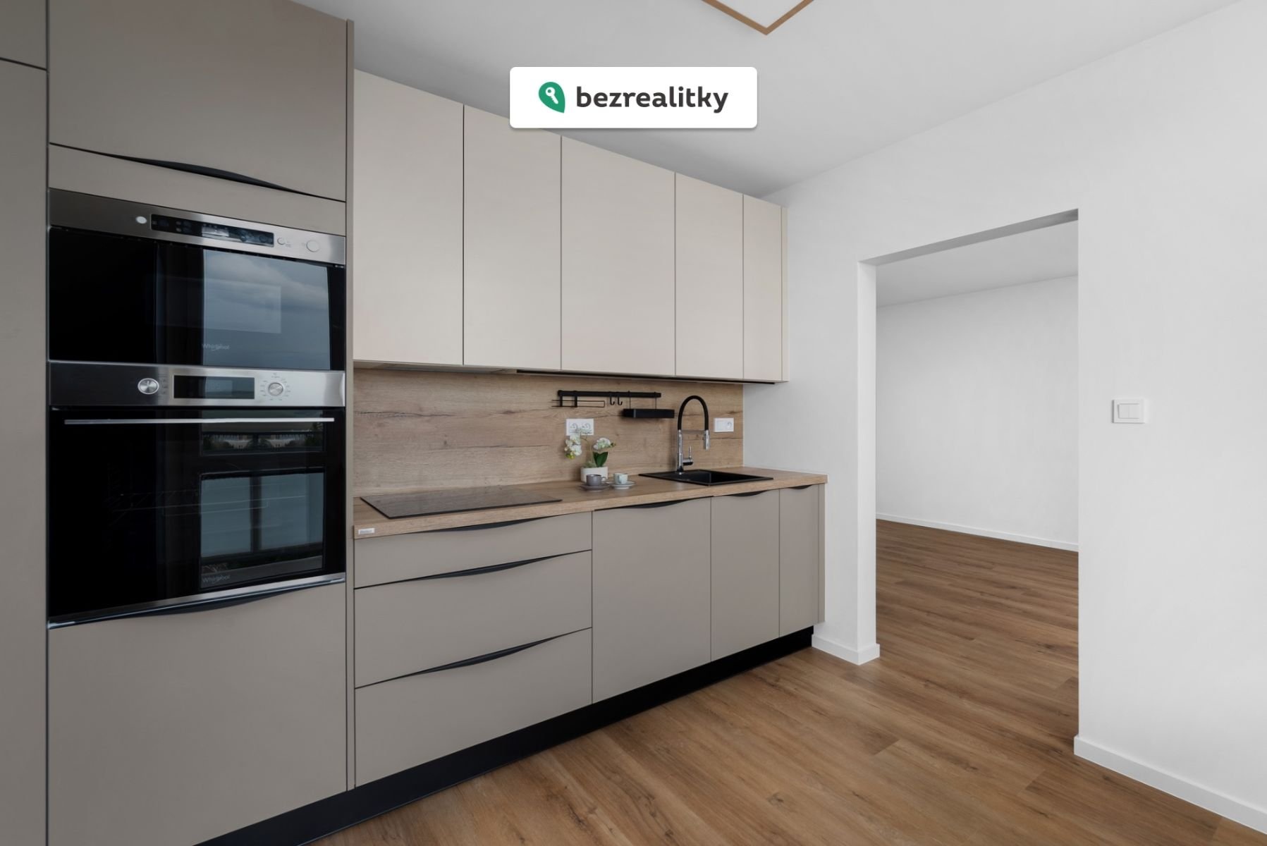 Součástí bytu je moderní kuchyňská linka na míru, vybavená vestavnými spotřebiči a dostatkem pracovního i úložného prostoru. Minimalistické linie a kvalitní materiály vytvářejí stylový a zároveň velmi praktický prostor pro každodenní vaření.