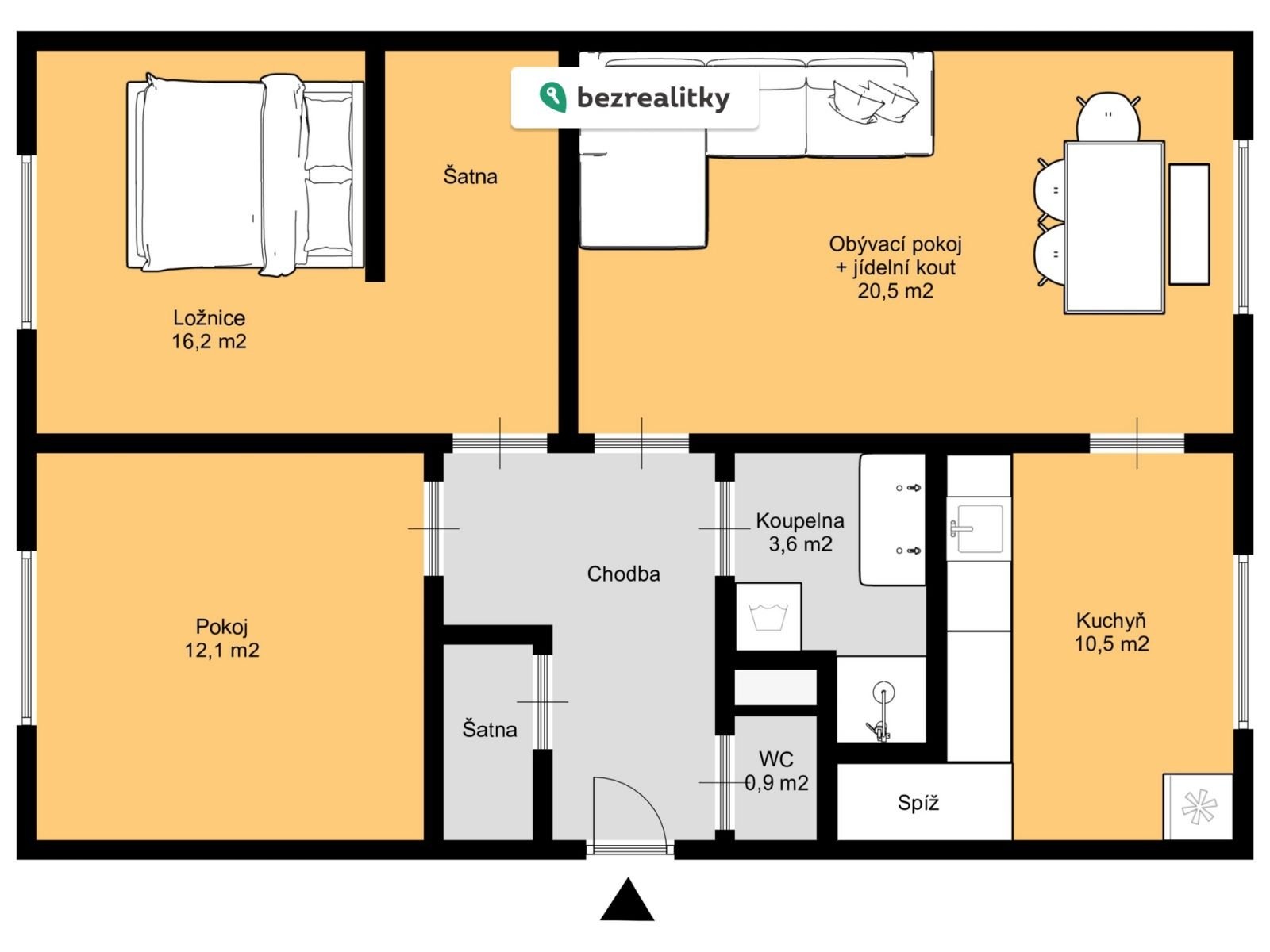 Dominantou bytu je prostorná obytná část, která nabízí dostatek místa pro pohodlné bydlení, relaxaci i jídelní kout. Velká okna zajišťují dostatek přirozeného světla a podtrhují vzdušnost celého prostoru.