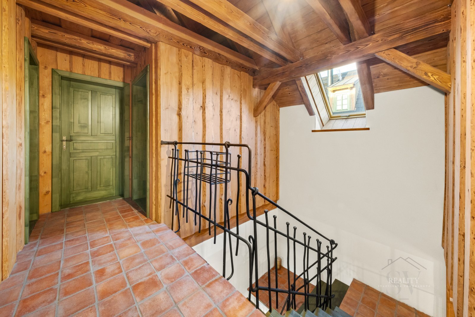 Interiér je promyšlen do posledního detailu – masivní dřevo, ručně malované obklady a precizní kovářská práce tvoří nadčasový celek. Kuchyň na míru a společenská zóna s kamny jsou srdcem domu: krásné na pohled, funkční v každodenním provozu.