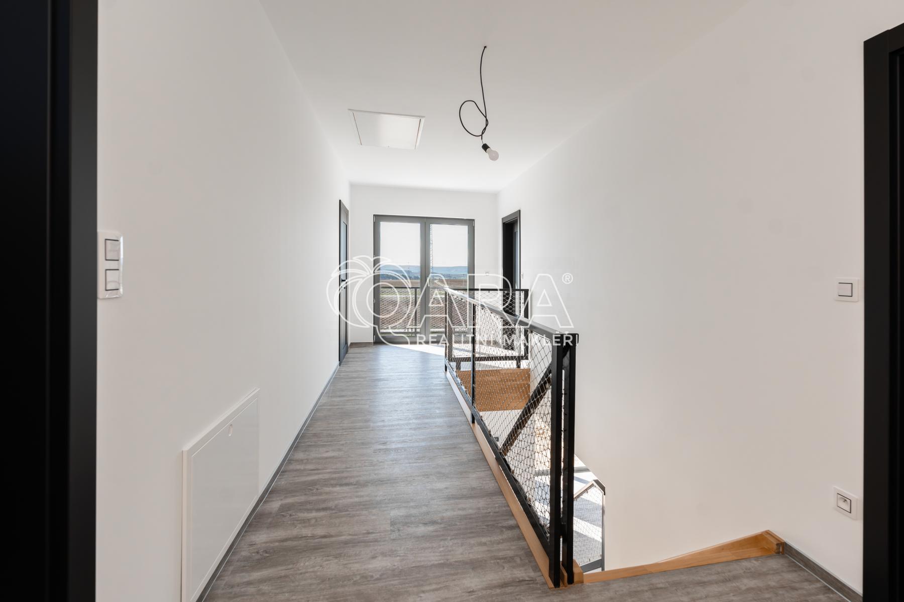 Vinylové podlahy a dlažby, okna s trojskly, kvalitní interiérové dveře, designové schodiště s dřevěnými nášlapy, kompletní sanitu, regulaci vytápění, oplocení, vsakovací nádrž na dešťovou vodu, videotelefon a elektrickou vjezdovou bránu.