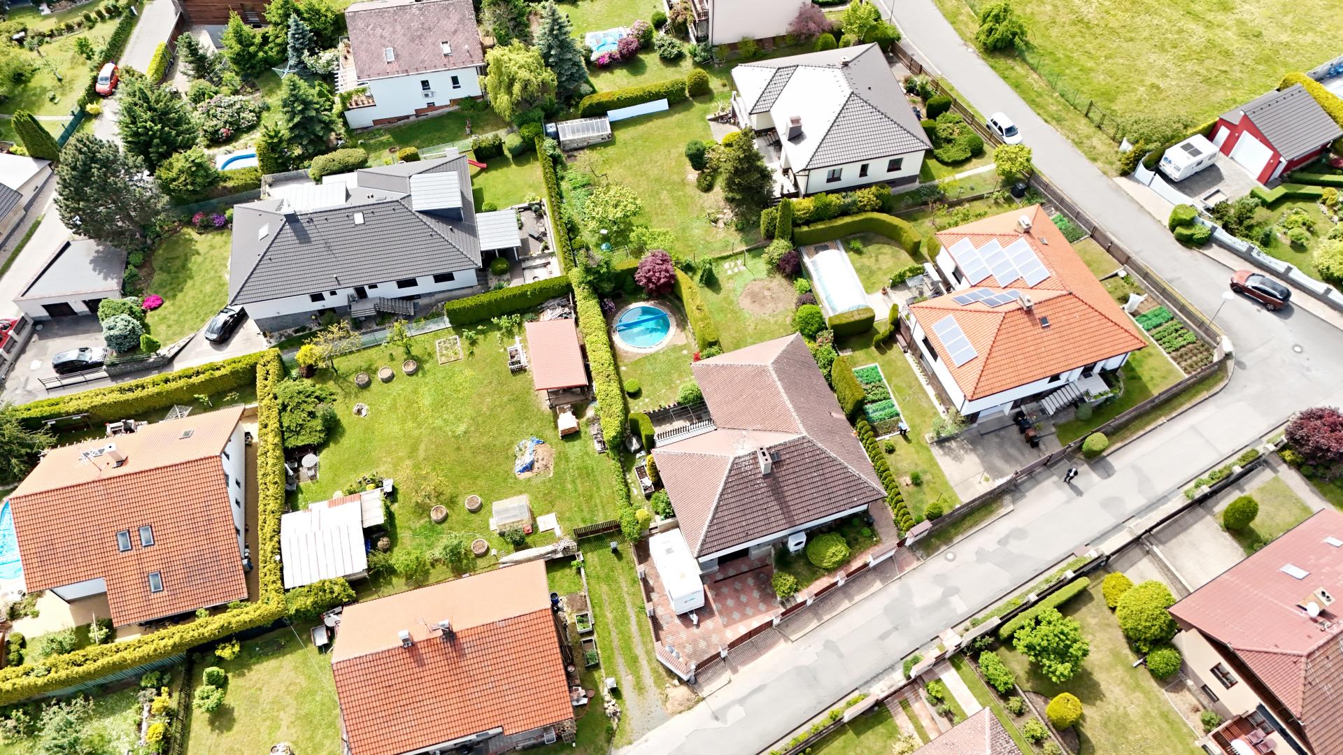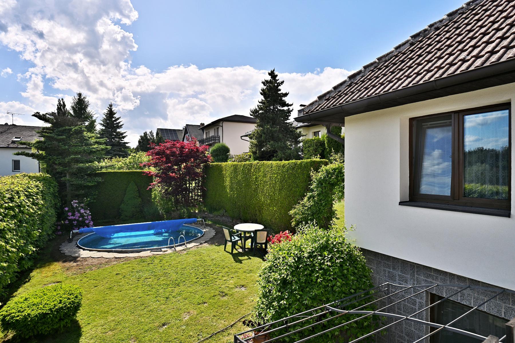 V přízemí se nachází samostatná jednotka 2+kk se zcela odděleným vstupem ze zahrady, která nabízí ideální zázemí pro hosty, nebo jako výhodnou investiční příležitost k pronájmu. Součástí domu je také dvougaráž, sklepní prostory a upravená zahrada se zapuštěným bazénem a vlastní studnou. Parkování je zajištěno nejen v garáži, ale také na zpevněné ploše s kapacitou pro další dva automobily.