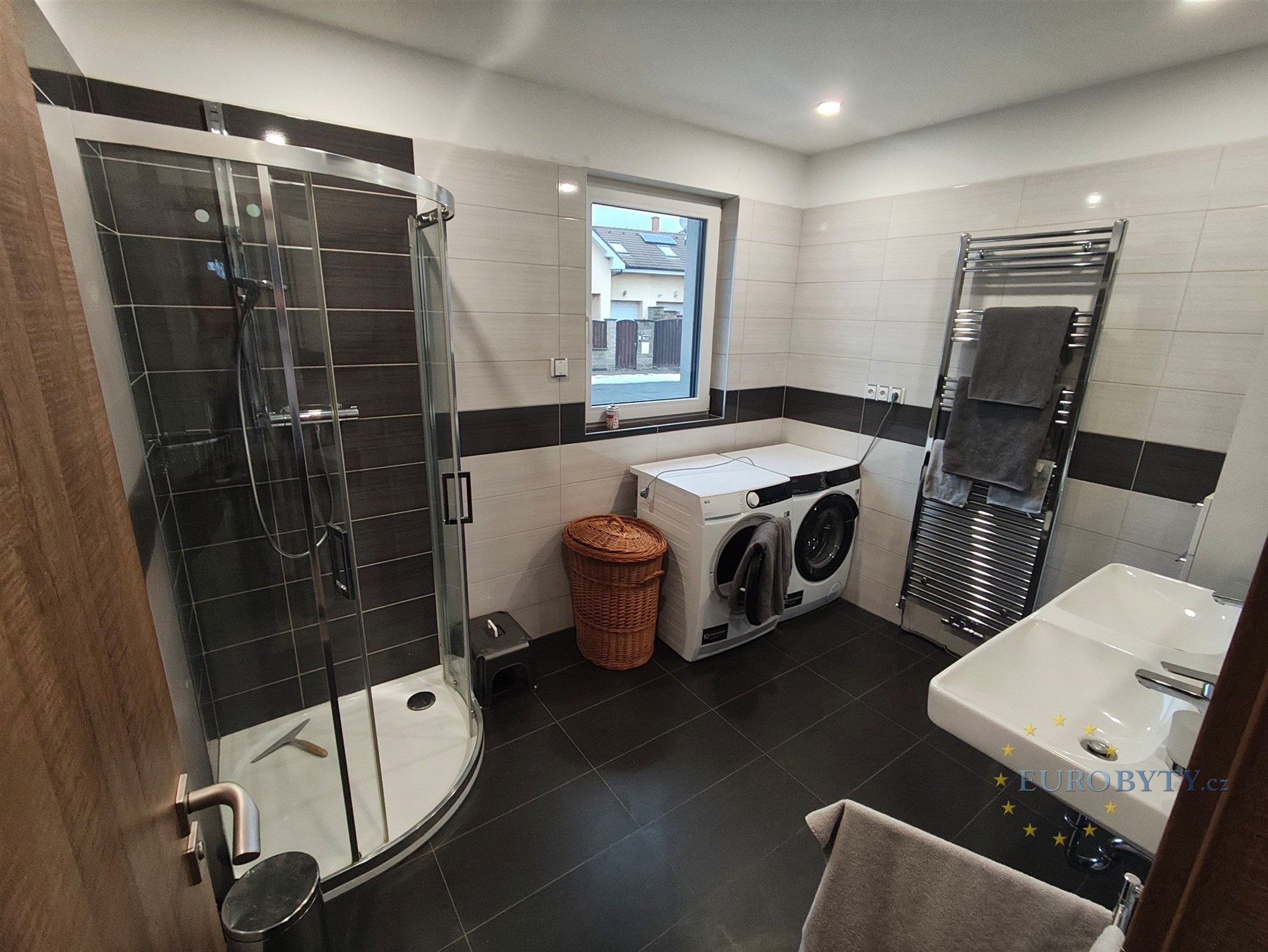 Ve výhradním zastoupení vlastníka si Vám dovolujeme nabídnout pronájem velmi pěkného rodinného domu o vnitřní podlahové ploše cca 142m2, Prahavýchod, Vyžlovka, ul. U Pískovny. Jedná se o samostatnou, dvoupodlažní novostavbu z r. 2019, která se nachází se v oblasti s převahou rodinných domů se zahradami. Dispozice domu je velmi dobře řešena v přízemí se nalézá velký obývací pokoj se sedací soupravou, krbovými kamny a plně vybaveným kuchyňským koutem s vestavěnými spotřebiči, dále pak pokoj pro hosty, koupelna s vanou, sprchovým koutem a toaletou, předsíň a vstupní chodba s krásným dřevěným schodištěm do patra. Obývací pokoj je dále francouzskými okny propojen se zahradou, jejíž součástí je krytá terasa, venkovní krb, parkovací stání a v rohu pozemku i samostatná stylová vinotéka s posezením. V patře domu jsou dvě ložnice, prostorná šatna, druhá koupelna se sprchovým koutem, pračkou a sušičkou a technická místnost s další toaletou. Moderní interiérové dveře a doplňky, vestavěné šatní skříně a další nábytek, podlahy plovoucí a dlažba, kvalitní plastová okna s venkovními žaluziemi. Dům je kompletně zabezpečen alarmem a kamerovým systémem, k dispozici internet a satelitní TV. O podlahové vytápění a ohřev vody se stará tepelné čerpadlo, což ve spojení s moderními materiály a technologiemi zajišťuje nízkou energetickou náročnost. Obec Vyžlovka je vzdálena cca 30km od Prahy a je zde úřad, škola, obchod a několik restaurací (kompletní občanská vybavenost v nedalekých Říčanech), jinak jde o velmi klidnou lokalitu s možností relaxace v přírodě lesy, rybníky, koupaliště, cykloturistika atd. Ideální pro pár, či menší rodinu, preferujeme zájemce o dlouhodobější spolupráci, pokud možno bez velkých domácích zvířat. Nájemné bylo stanoveno ve výši 35.000,Kč/měs. + záloha na zúčtovatelné služby a energie cca 6.000,Kč (v závislosti na počtu osob). Volný ihned, v případě zájmu o prohlídku neváhejte kontaktovat našeho realitního makléře.