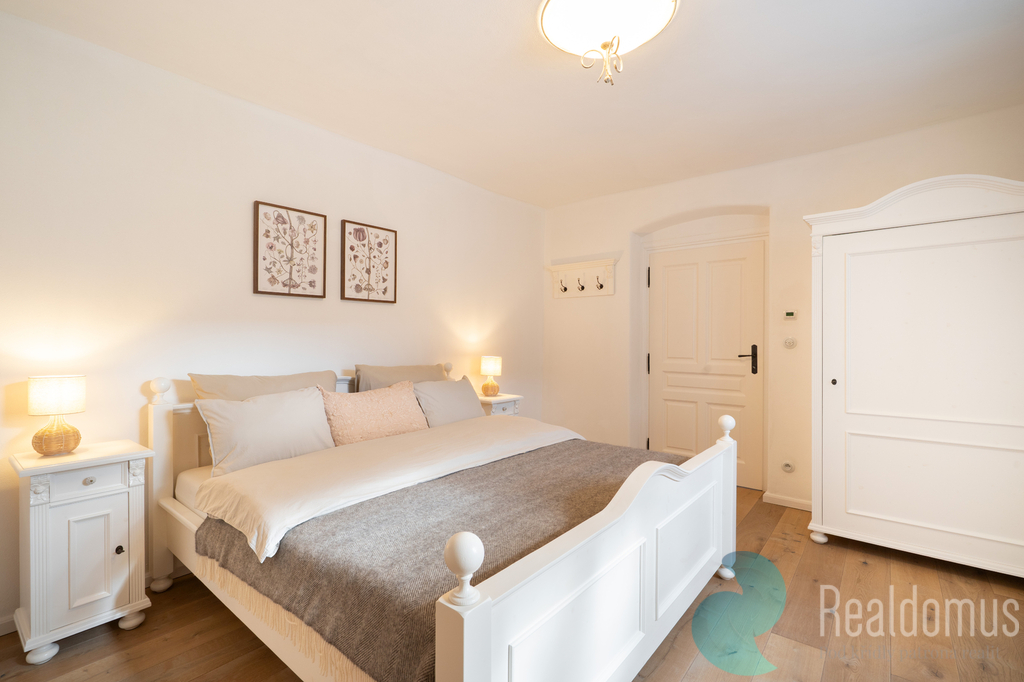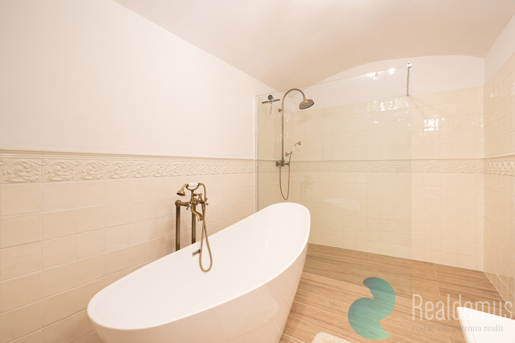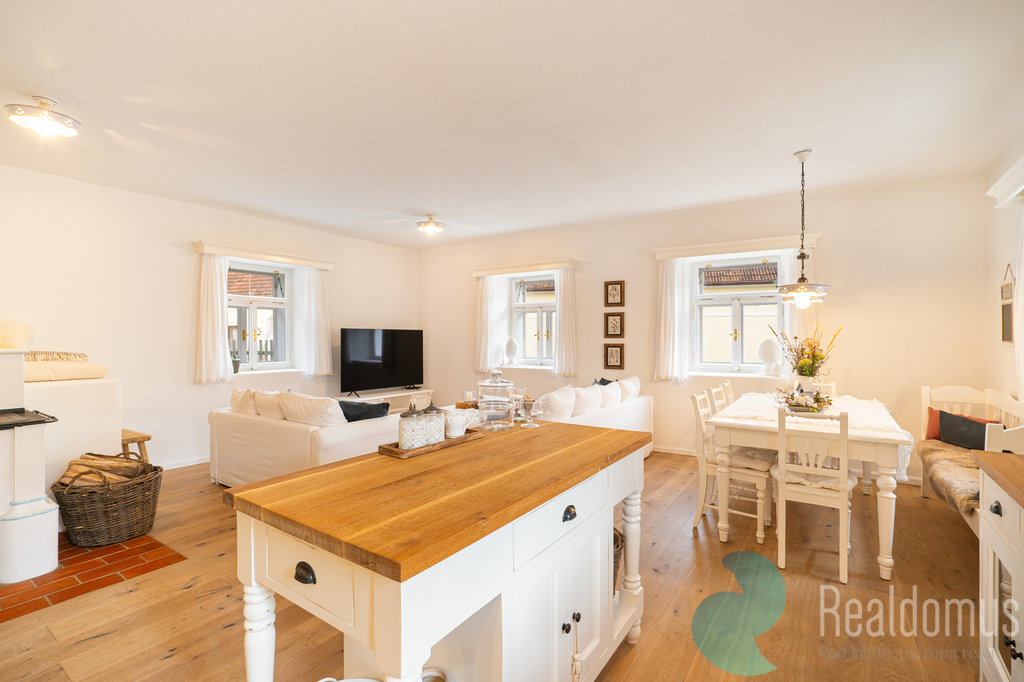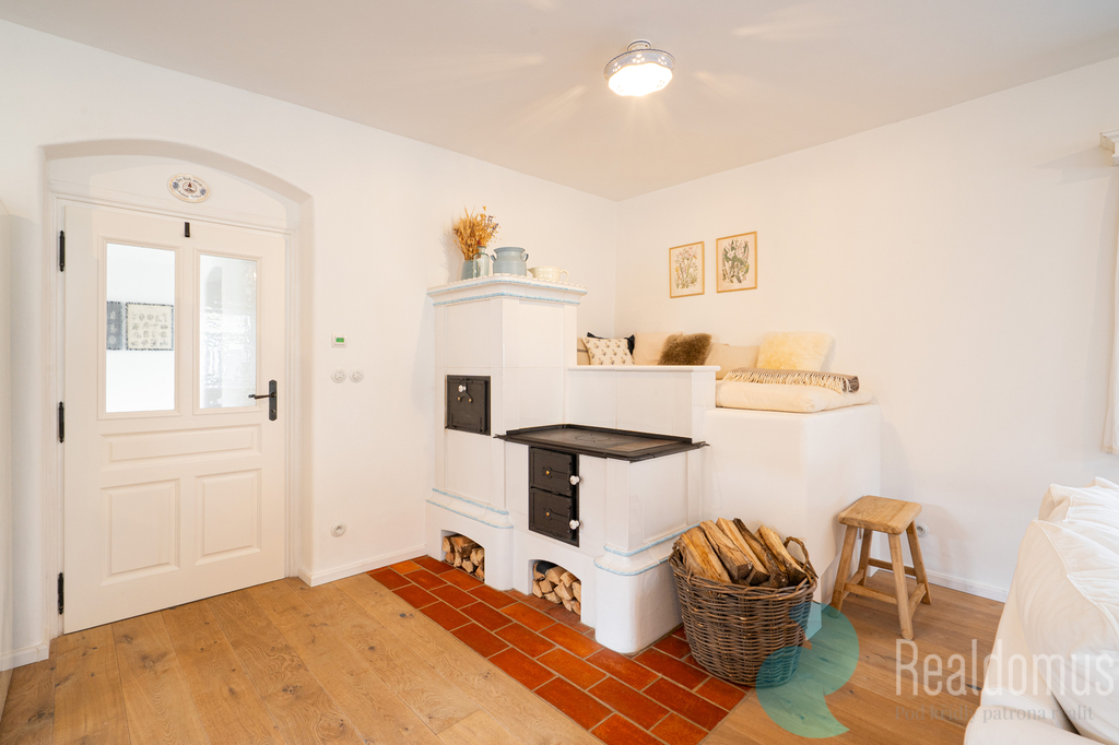 Za zdmi uzavřeného dvora objevíte svět, kde čas plyne pomaleji. V domě se nacházejí tři ložnice, dvě koupelny a prostorná obytná kuchyně, jejíž atmosféru dotvářejí kamna s pecí. Majitelé provedli velmi citlivou rekonstrukci, jejíž podstatou bylo použití tradičních prvků, jako jsou trasvápenné omítky, špaletová okna, dubové podlahy, porcelánové zásuvky a vypínače, ručně vyráběná italská svítidla či retro-sanita, díky nimž si dům uchoval svůj původní historický charakter. Každý detail působí jako malý umělecký šperk – od původního starého dřeva po kvalitní dlažby. Dům je navíc podsklepený a technicky připravený i pro moderní technologie, včetně chytrého ovládání vytápění.
