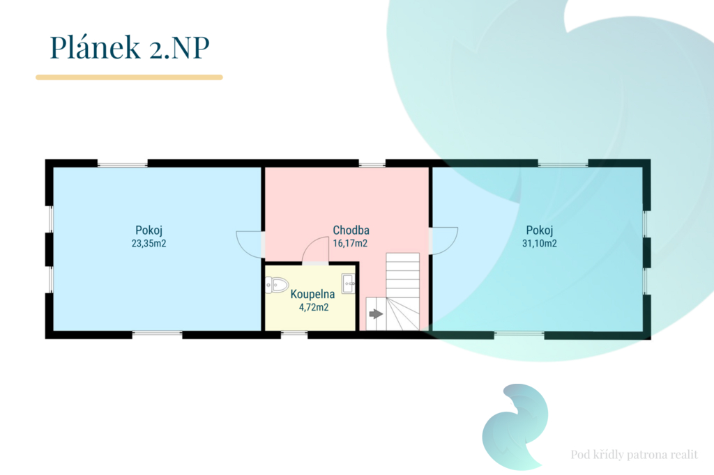 - Podkroví: pokoj 31,10 m², pokoj 23,35 m², toaleta s umyvadlem 4,72 m²
